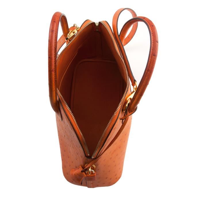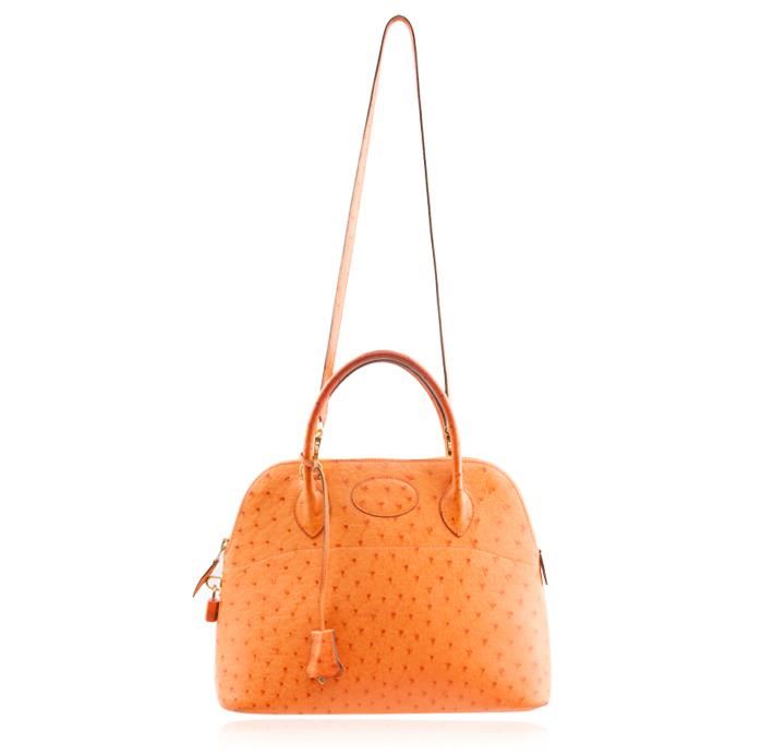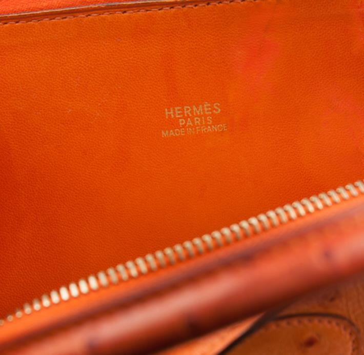 One Hermes ostrich bolide handbag featuring: ostrich exterior, leather interior, orange exterior & interior, gold toned hardware, overall zipper closure and measures 12.25" w x 5" d.