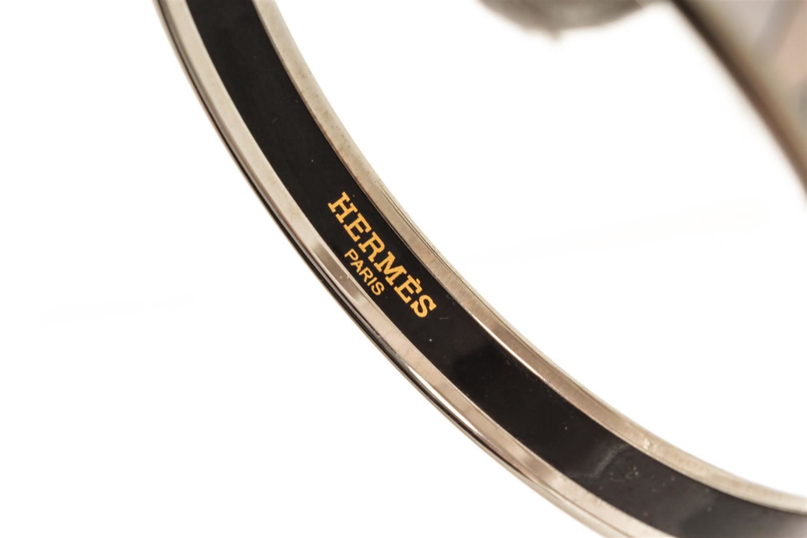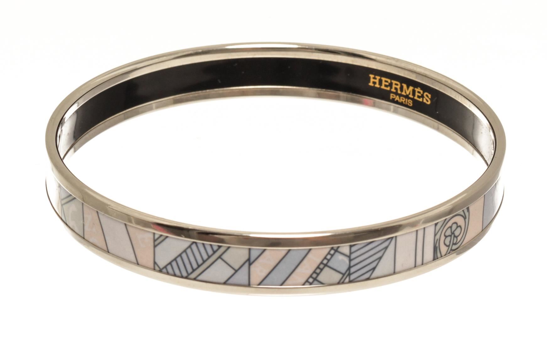 One Hermes Purple Email Bangle with Silver Hardware. Item is sold AS-IS. All available information is listed in the description and shown in the photo. Hermes purple Email bangle with silver hardware, black enamel inside with the Hermes Paris logo, and purple graphic on the outside.