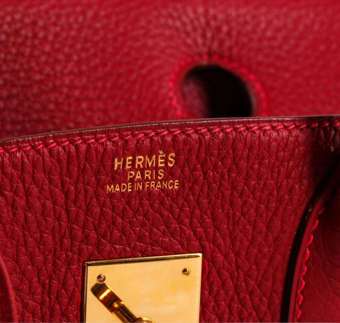 One Hermes red Birkin bag in good condition. The bag features a small zippered pouch and an additional flap pouch for storage and easy organization. The bag measures approximately 11.5" x 8.25" x 6".