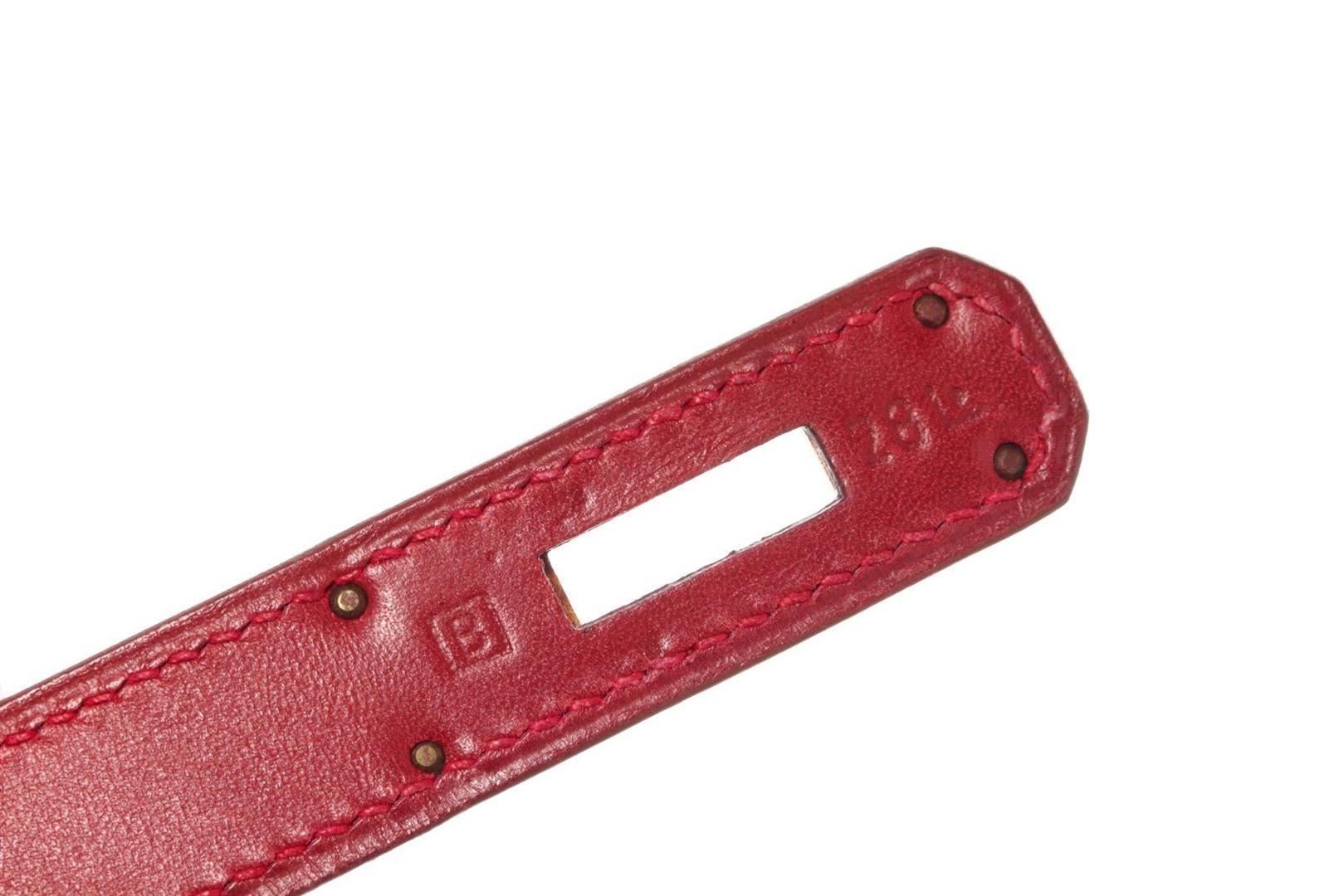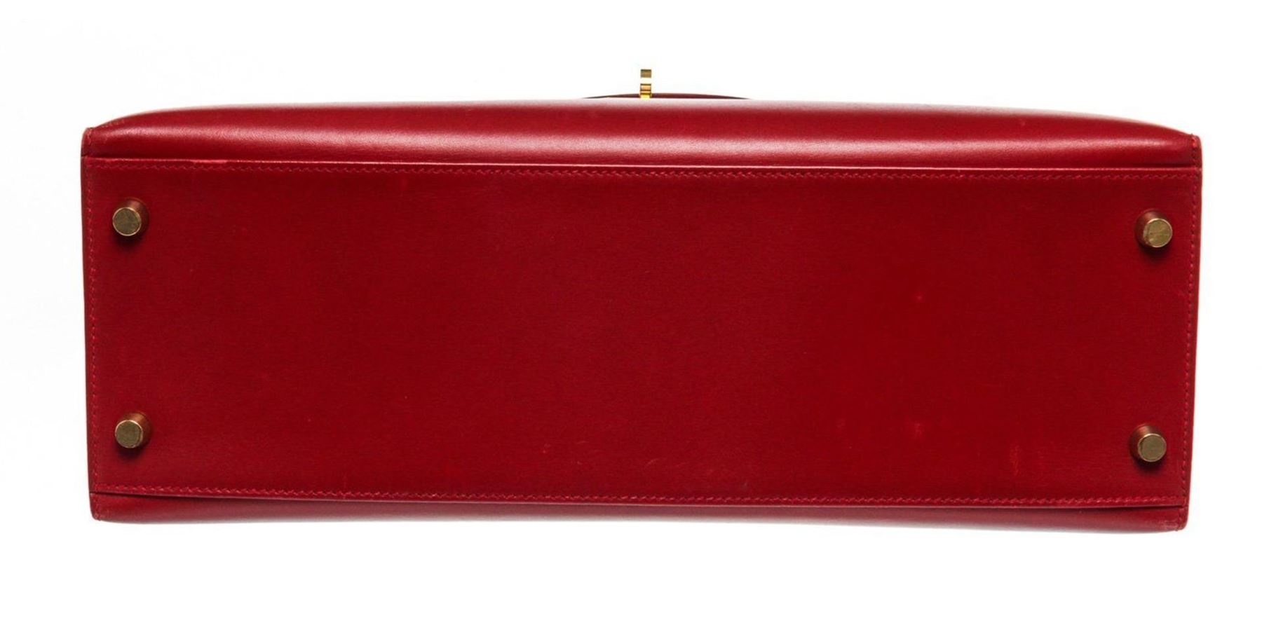 Hermes Red Leather Kelly 32cm Handbag with leather, gold plated hardware, trim leather, interior zip pocket, lining leather, top handle, and turn lock closure. Measurements: 12.75 in / 32 cm 4.75 in / 12 cm 9 in / 23 cm Condition: Pre-Owned Good