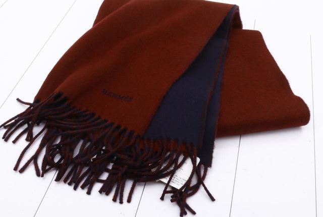 Red and navy blue cashmere Hermes Recto-Verso muffler with signature "Hermès" embroidery.