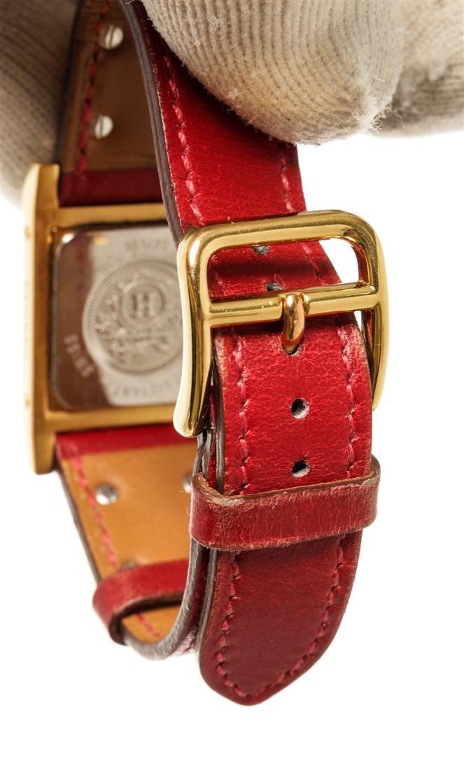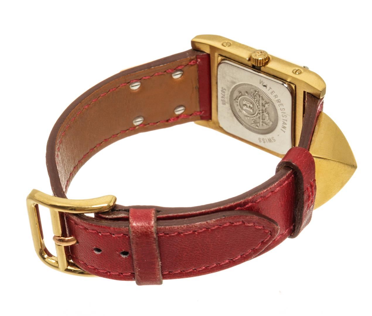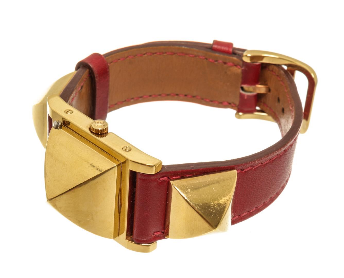 One Hermes Red gold-Plated and Leather Medor Quartz 23mm Watch. Item is sold AS-IS. All available information is listed in the description and shown in the photo. Hermes Red gold-Plated and Leather Medor Quartz 23mm Watch with square face, leather/gold-plated, signature Clous de Paris stud detailing, mineral glass, canned crown.