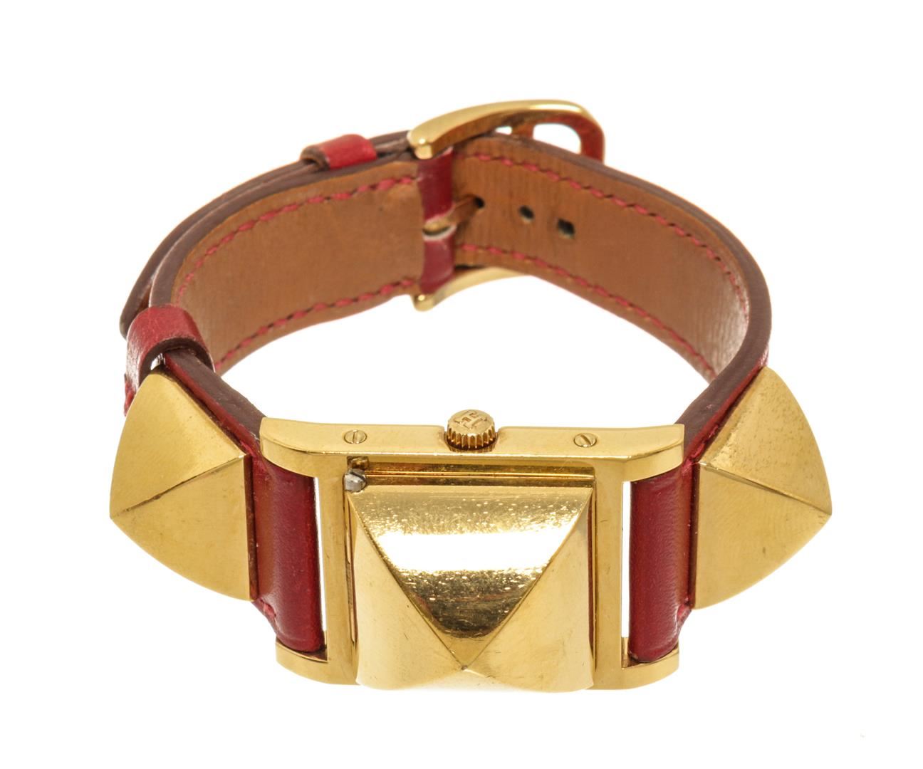 One Hermes Red gold-Plated and Leather Medor Quartz 23mm Watch. Item is sold AS-IS. All available information is listed in the description and shown in the photo. Hermes Red gold-Plated and Leather Medor Quartz 23mm Watch with square face, leather/gold-plated, signature Clous de Paris stud detailing, mineral glass, canned crown.
