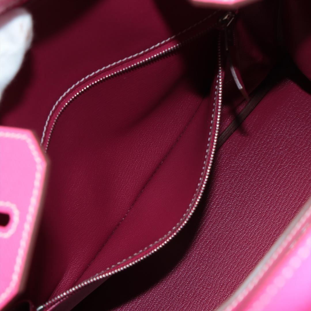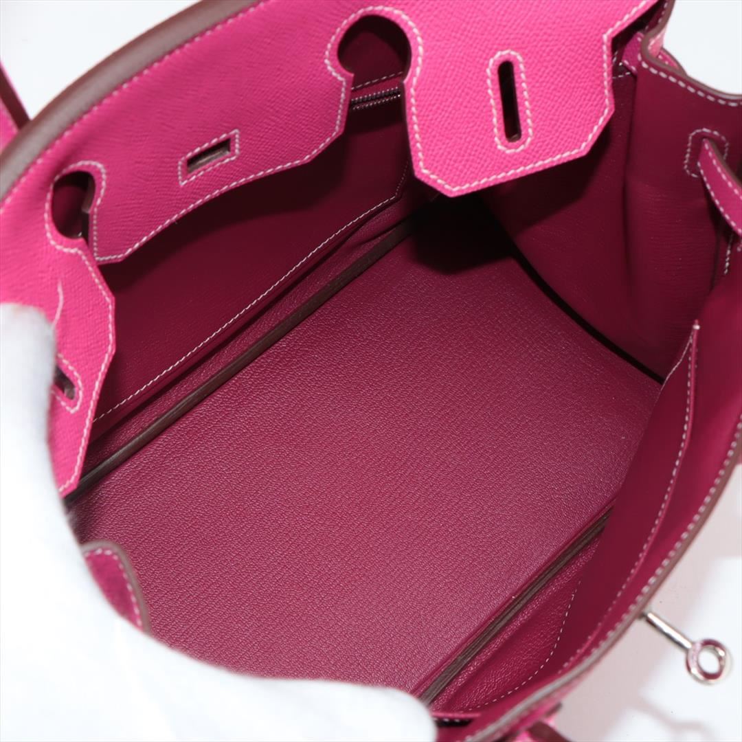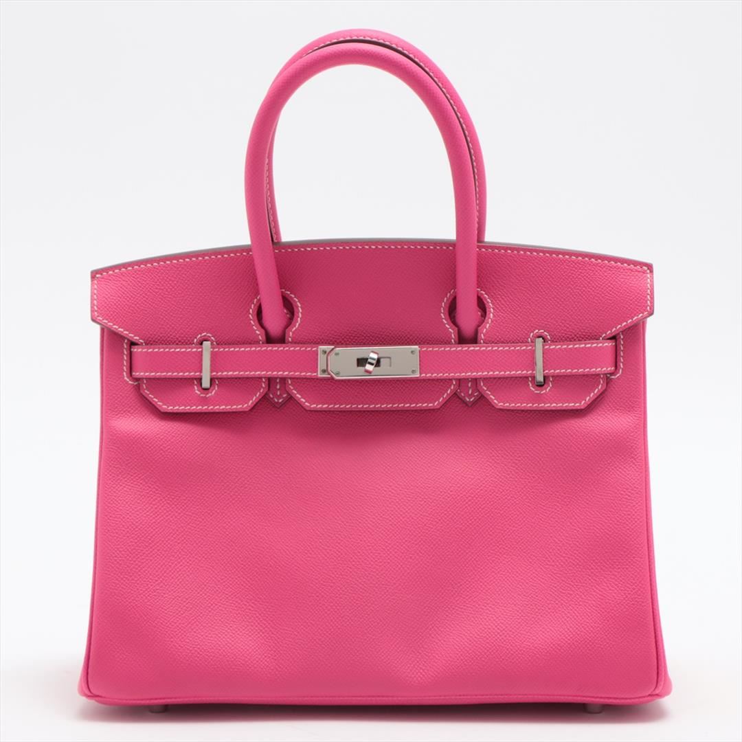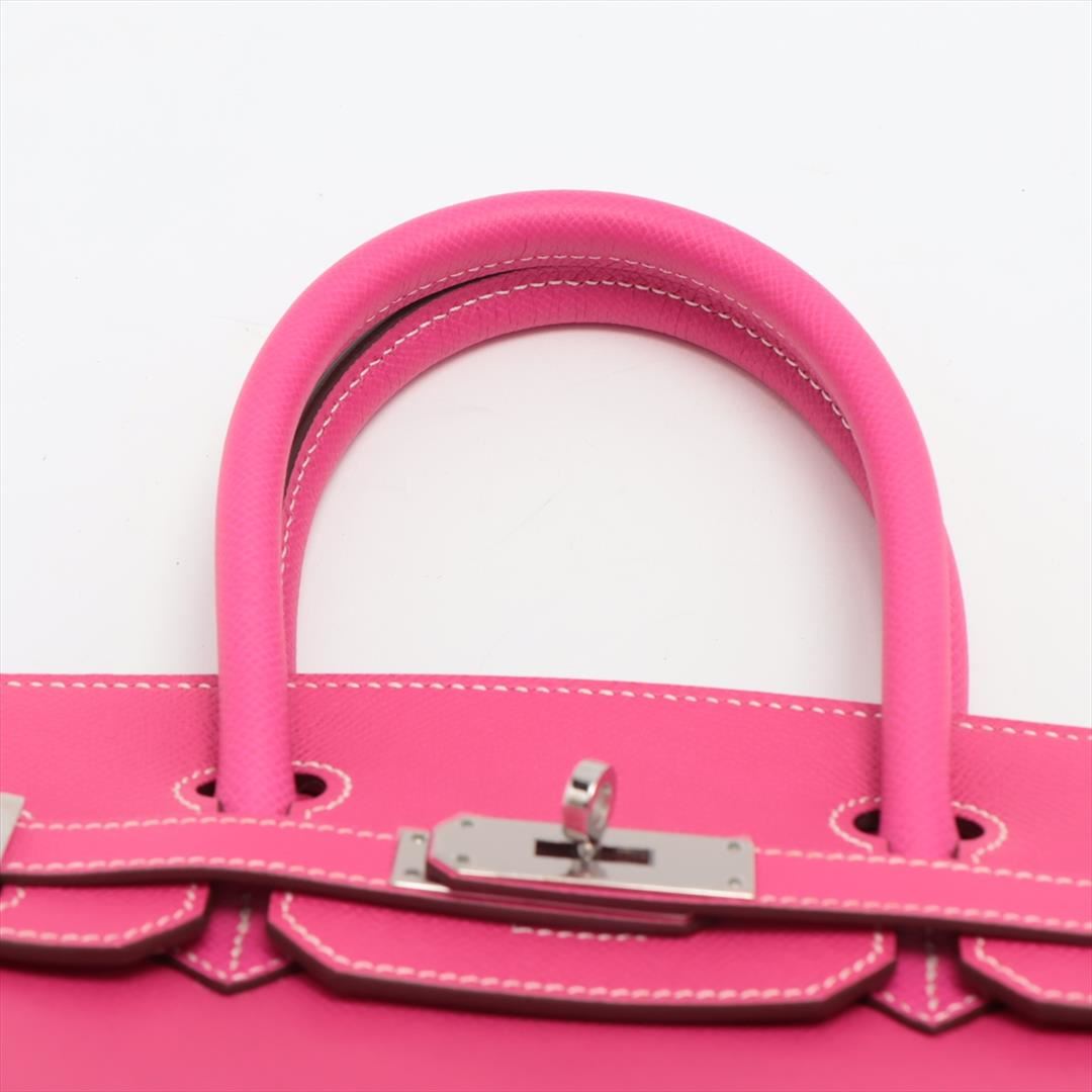 Rose Epsom leather Hermes Birkin 30 with Palladium hardware, white contrast stitching throughout, dual rolled top handles, protective feet at base, tonal leather interior, dual pockets at interior walls; one with zip closure and turn-lock closure at front