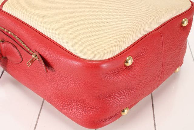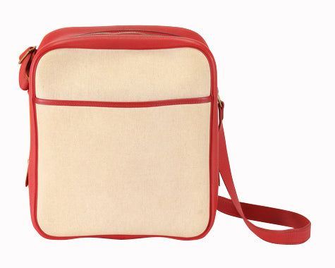 Authentic Vintage Hermes Victoria Messenger bag in Rouge Garance Red Leather and Beige Toile Coated Canvas. The front has an exterior slip pocket. The main access is secured with a zipper. The inside is lined with beige fabric lining with a spacious inter