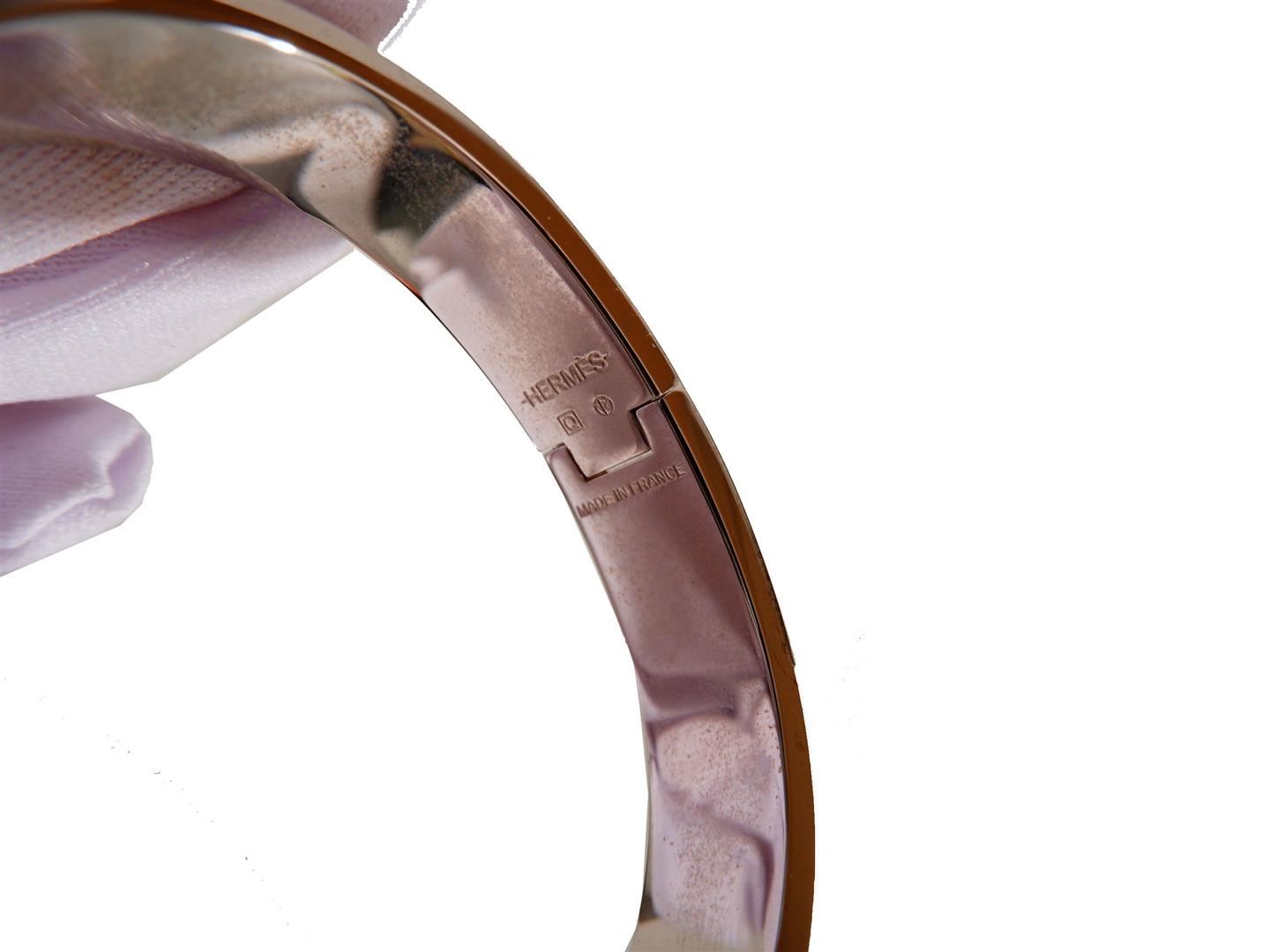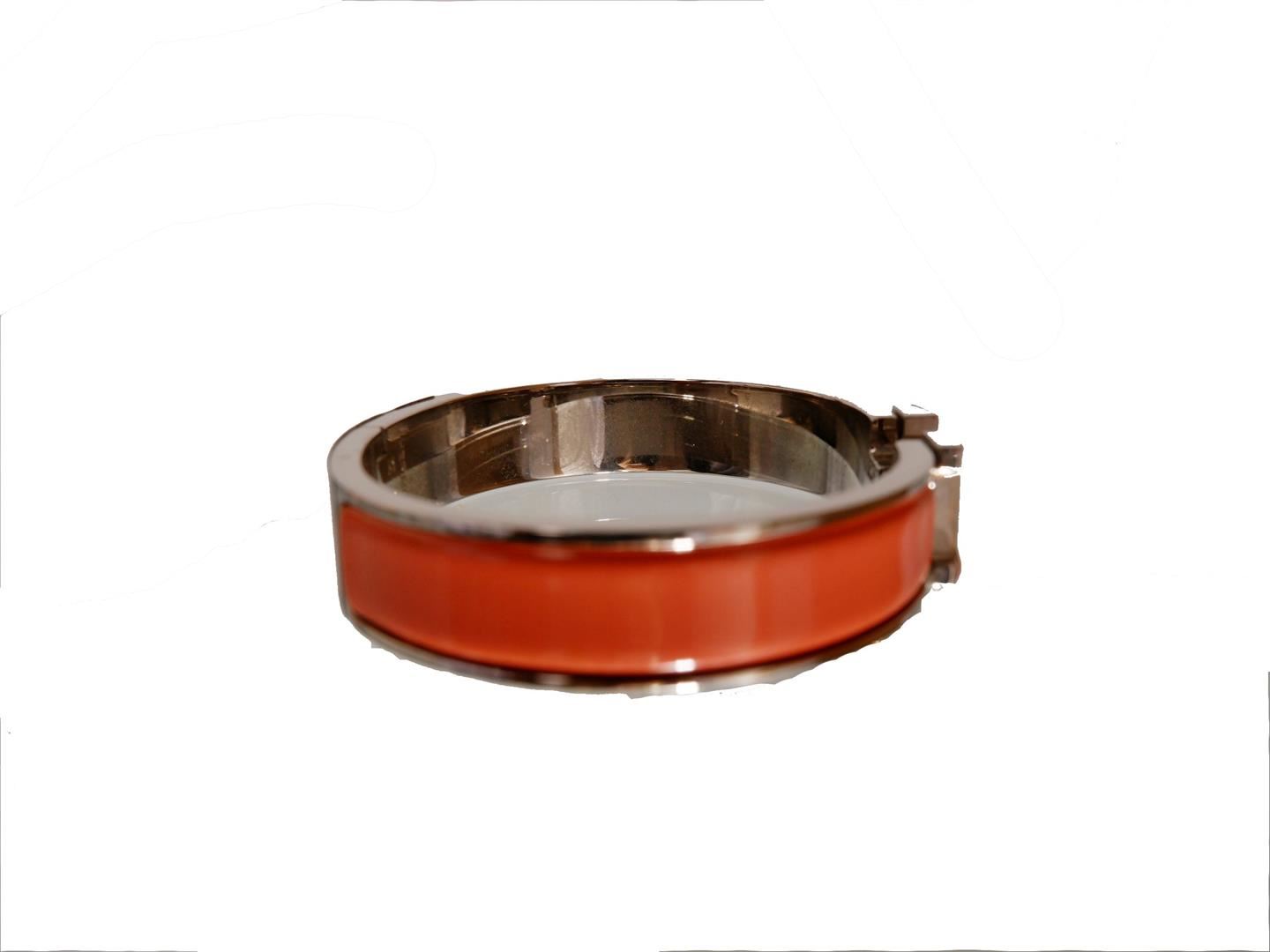 One Hermes Rouge Metal Clic Clac Bangle Bracelet. Item is sold AS-IS. Please check photos and descriptions for all available details. Rouge metal Hermes Clic Clac bangle with Palladium hardware and signature H turn-lock closure.