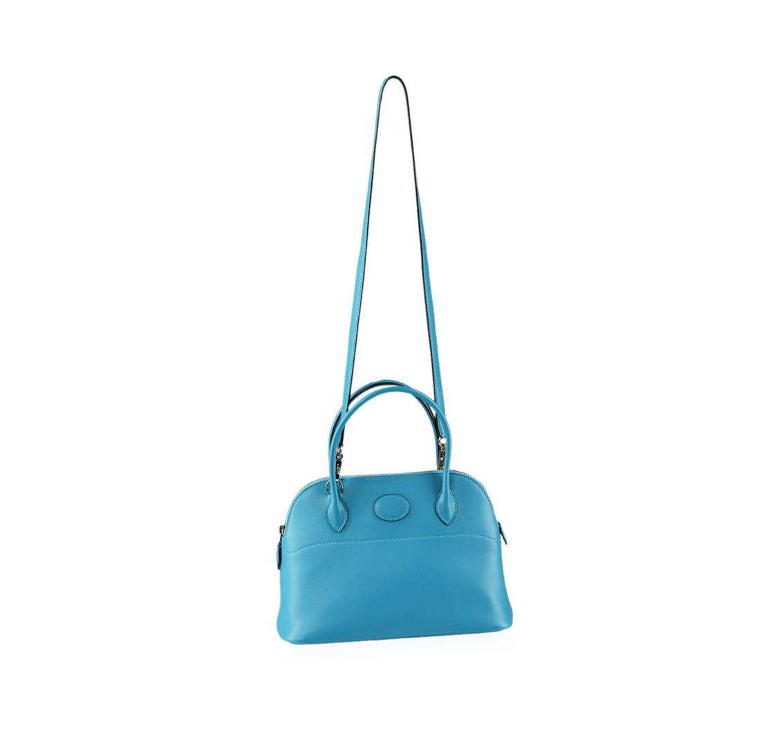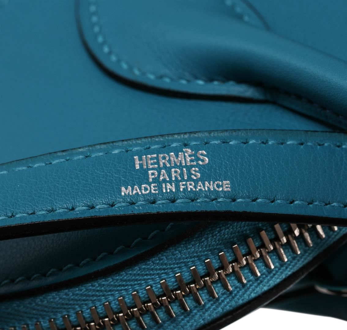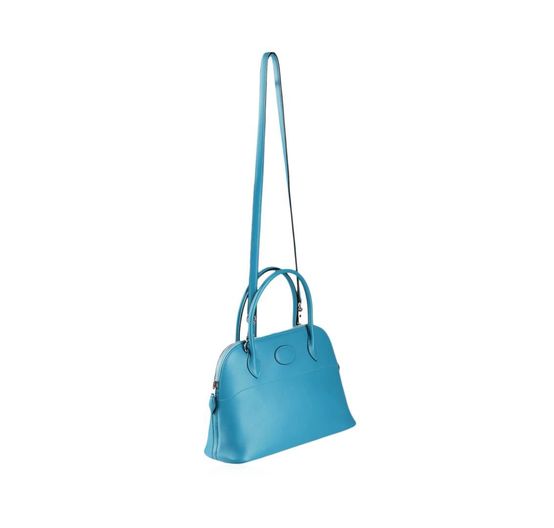 This Authentic Hermes Saint Cyr blue swift calfskin leather bag is a refined fusion of style and practicality. This roomy petite bag epitomizes everyday sophistication and makes a perfect everyday bag, large enough to hold all your essentials in style. The classic Hermes bag style features silver and palladium plated hardware. Made from the highest quality calfskin leather, this embossed leather is supple and durable. The bag also features both a shoulder and hand strap. Complete with a zip closure to protect all your personal items inside. The interior of the bag features one separate pocket. Condition: Like new; the exterior leather is clean and beautiful; the interior is clean and in great condition; no odor. Measurements: 10.5" wide, 7.5" tall, 4.5" handle drop. Includes original orange Hermes box and dust cover.