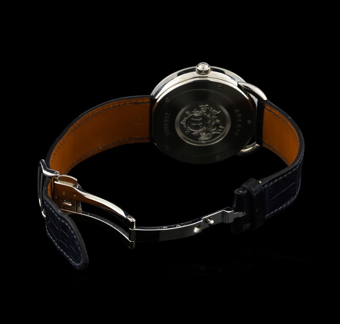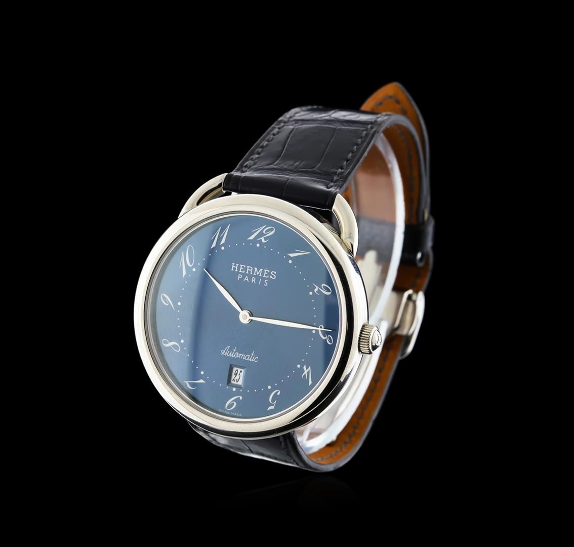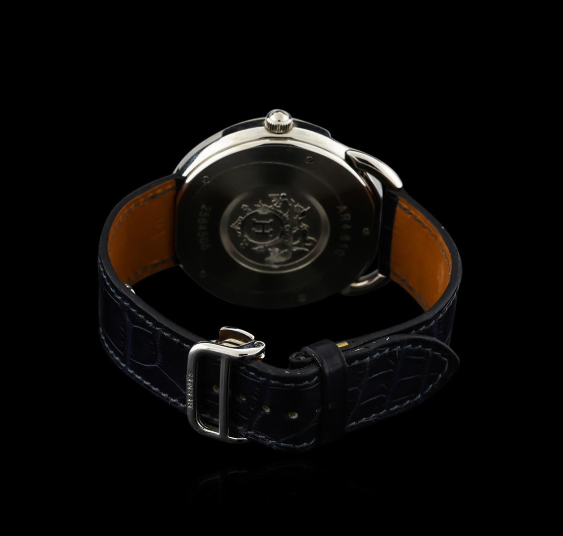 One, Hermes Stainless Steel Arceau TGM wristwatch electronically tested, Case: 41mm, Case Back: high relief Hermes logo, and engraved ID numbers, Crown: twin lock with Hermes logo, Bezel: fixed, high polish, Crystal: synthetic sapphire lens, Movement: Automatic. Hermes signed Dial: Blue color, with pointed hands, and numerals, Date Window: 6 o'clock position, Hermes Bracelet: saddle stitched leather strap, Hermes concealed clasp. Condition: G-5 Fine. Seven and one quarter inch length, adjustable. Total Weight of Watch 78.26gm. AIG Appraised at $3,050.00.