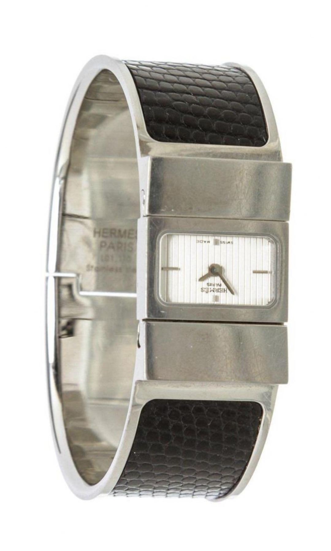 Stainless Steel Hermès Loquet watch featuring a quartz movement, smooth bezel, white dial and black lizard bracelet with slide lock closure. Measurements: Length: 1.18 in / 3 cm Width: 0.7 in / 2 cm 1 in / 3 cmCONDITION: Pre-Owned Good overall, please see photographs for detail.
