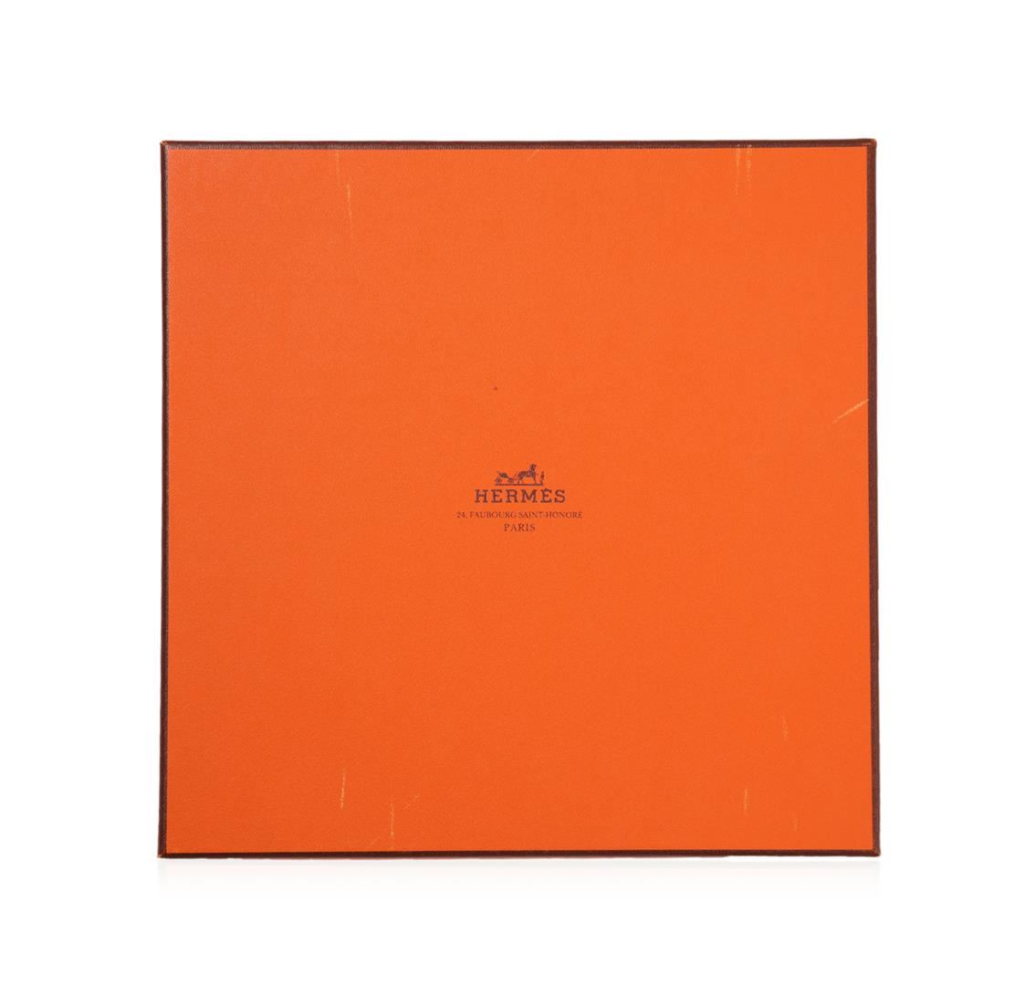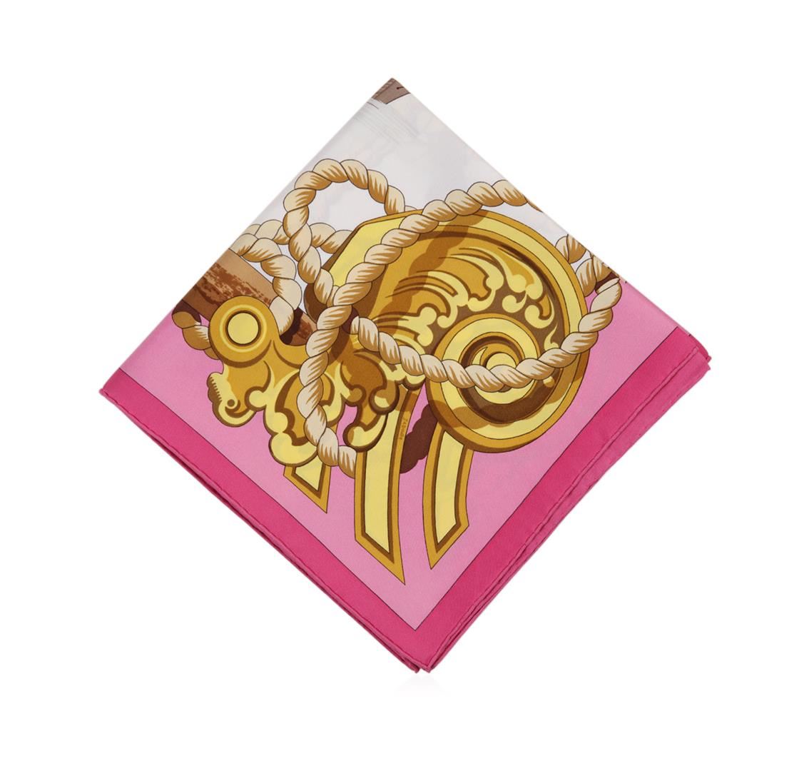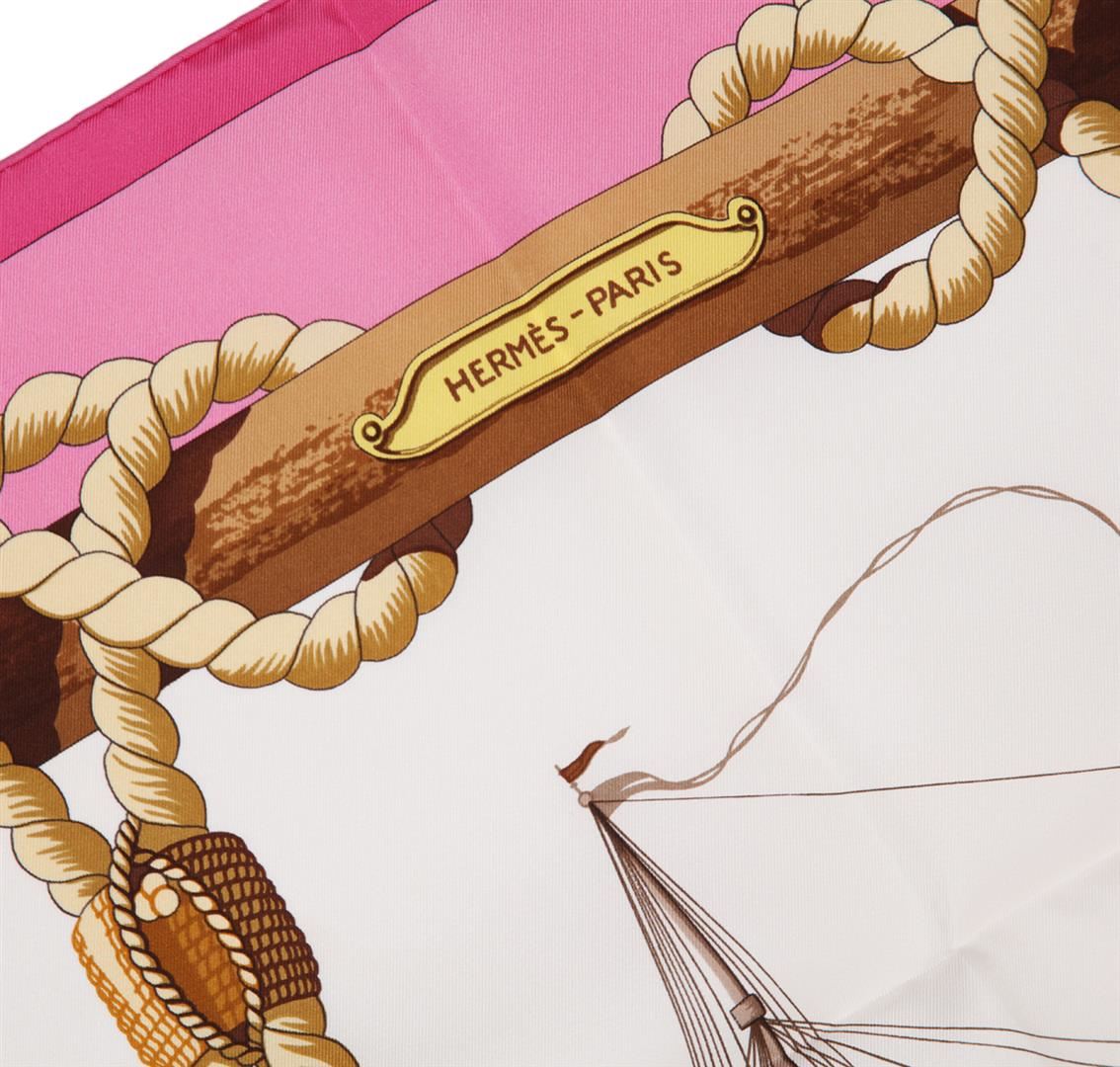 One Hermes silk scarf in good condition, measuring 90cm by 90cm. The scarf features the 'Tribord' design by Julia Abadie. The design features a framed clipper ship and other nautical motifs set against a pink background. Comes with an Hermes scarf box.