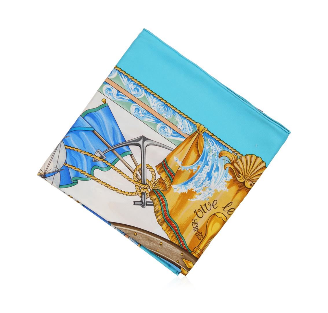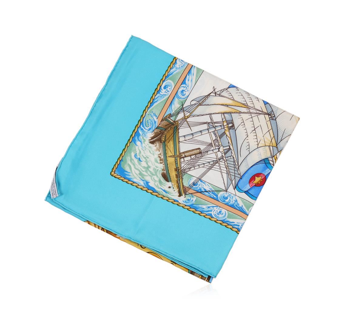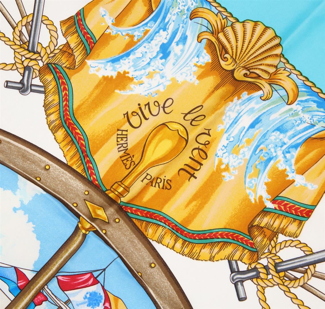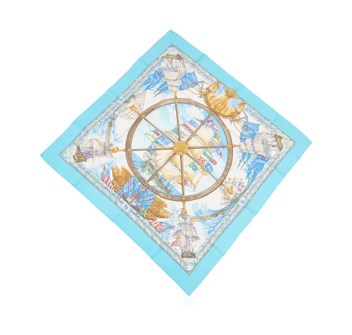 One Hermes silk scarf in good condition, measuring 90cm by 90cm. The scarf features the 'Vive le Vent' design by Laurence Thioune. The nautical themed design features one central ship and eight surrounding ships set against the spokes of a ship's wheel, bordered with a solid blue trim. Comes in an Hermes scarf box.