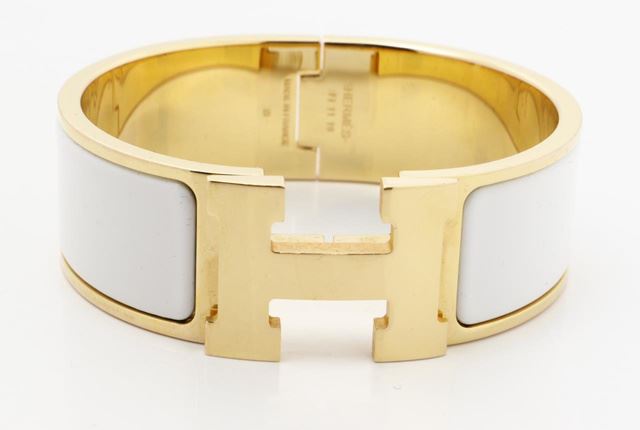 White metal Hermes Clic Clac Wide bangle with gold-tone hardware and CC turn-lock closure.