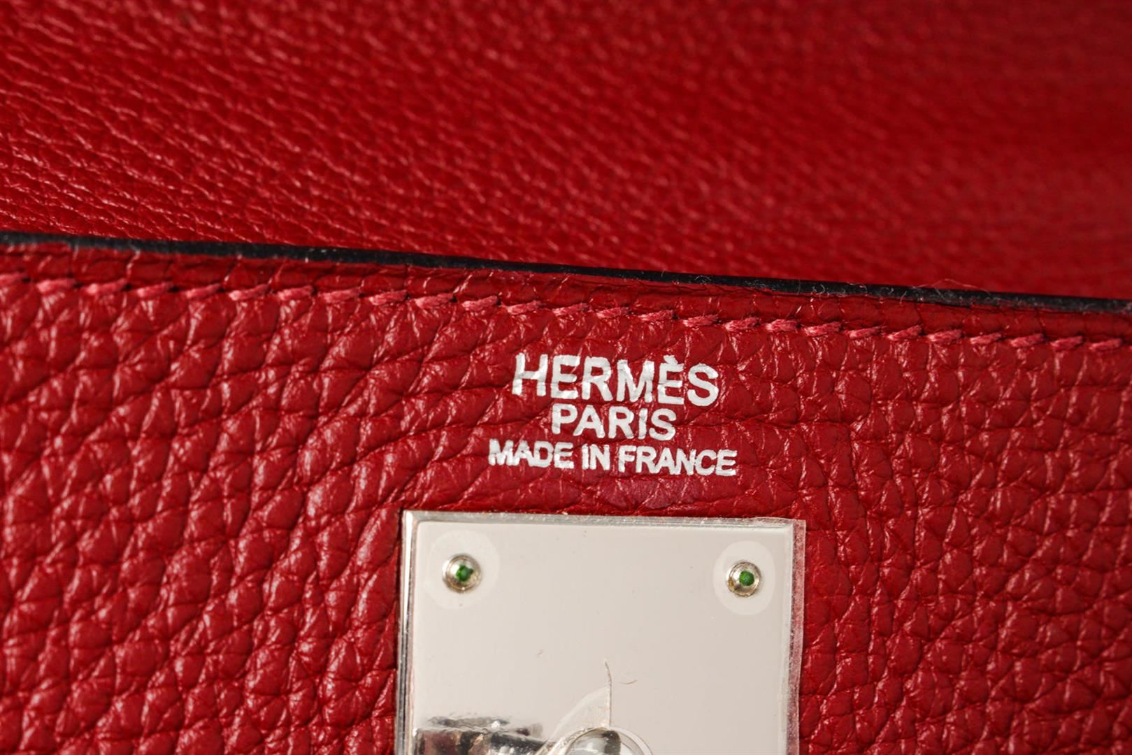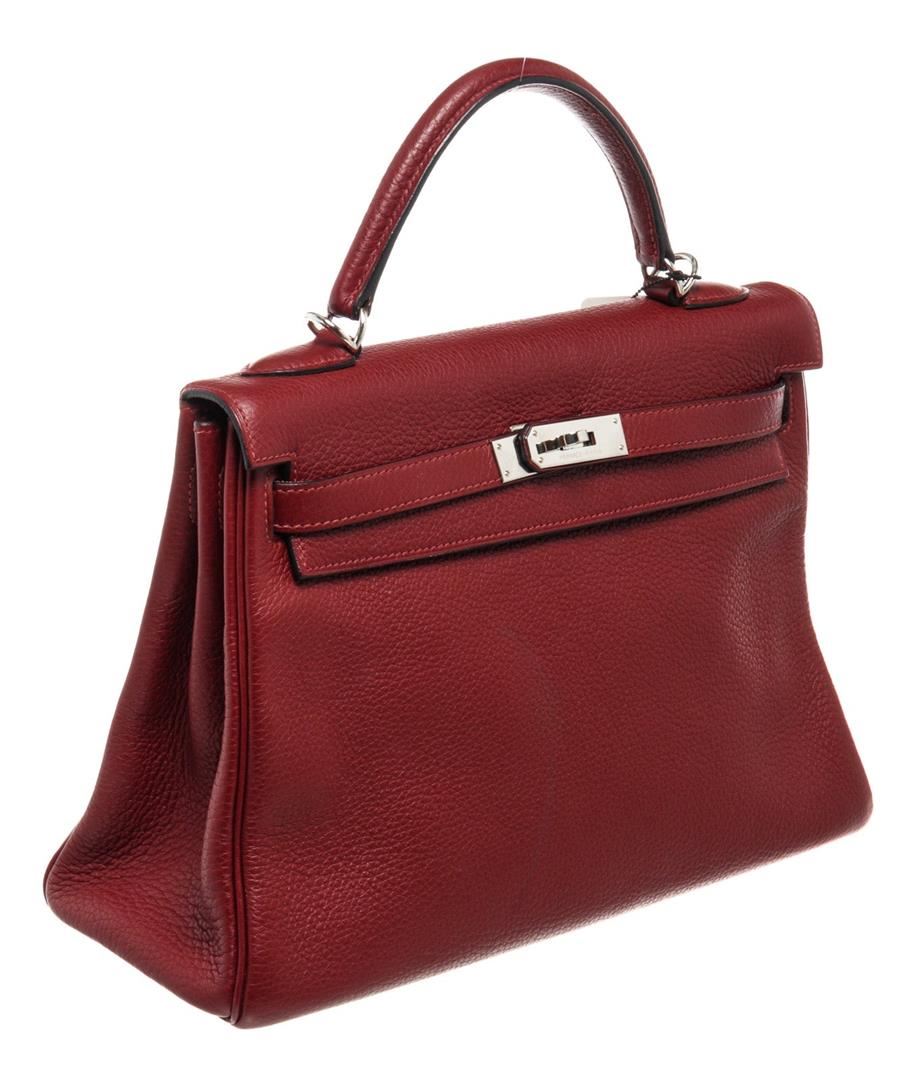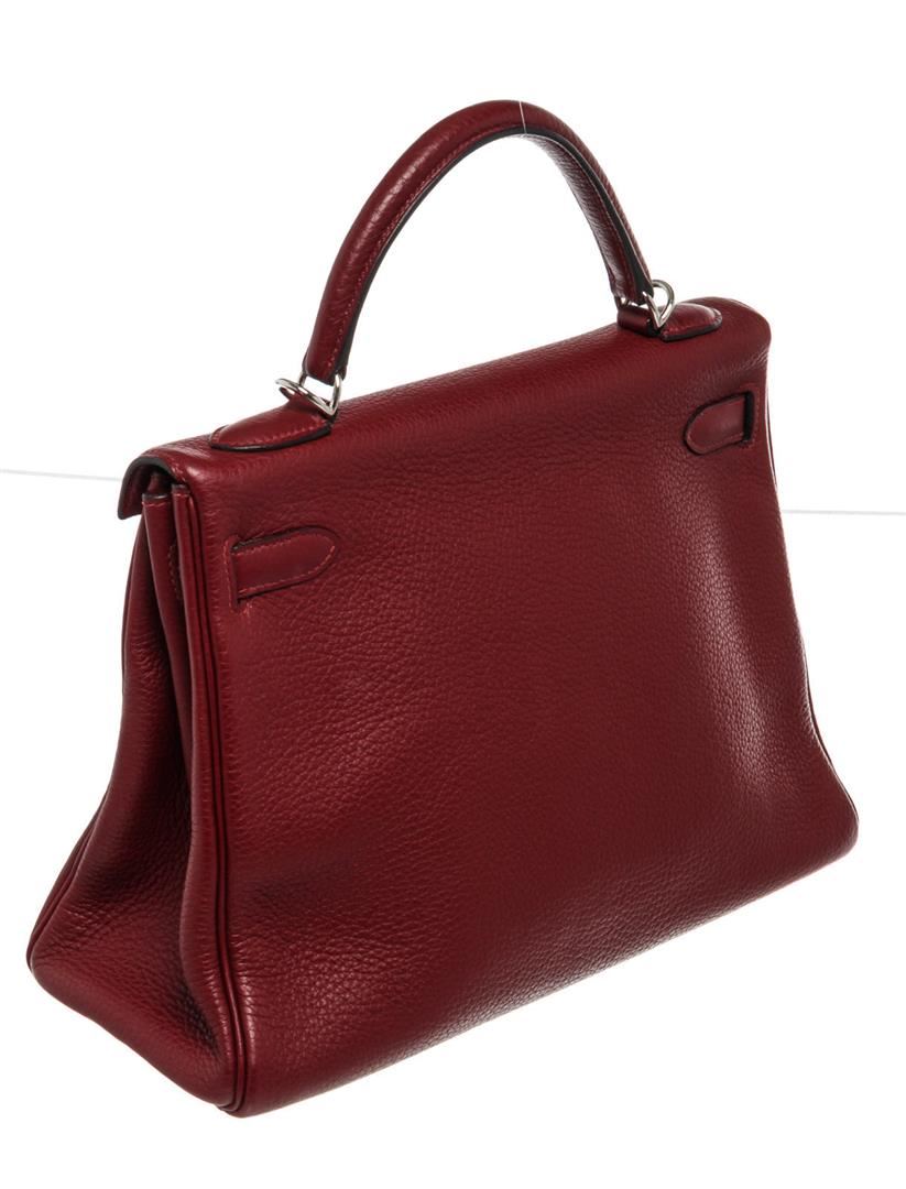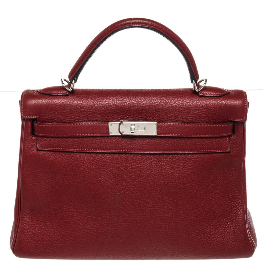 Hermes Red Leather Kelly 32cm Handbag with leather, gold-tone hardware, trim leather, interior zip pocket, lining leather, top handle, and turn lock closure.