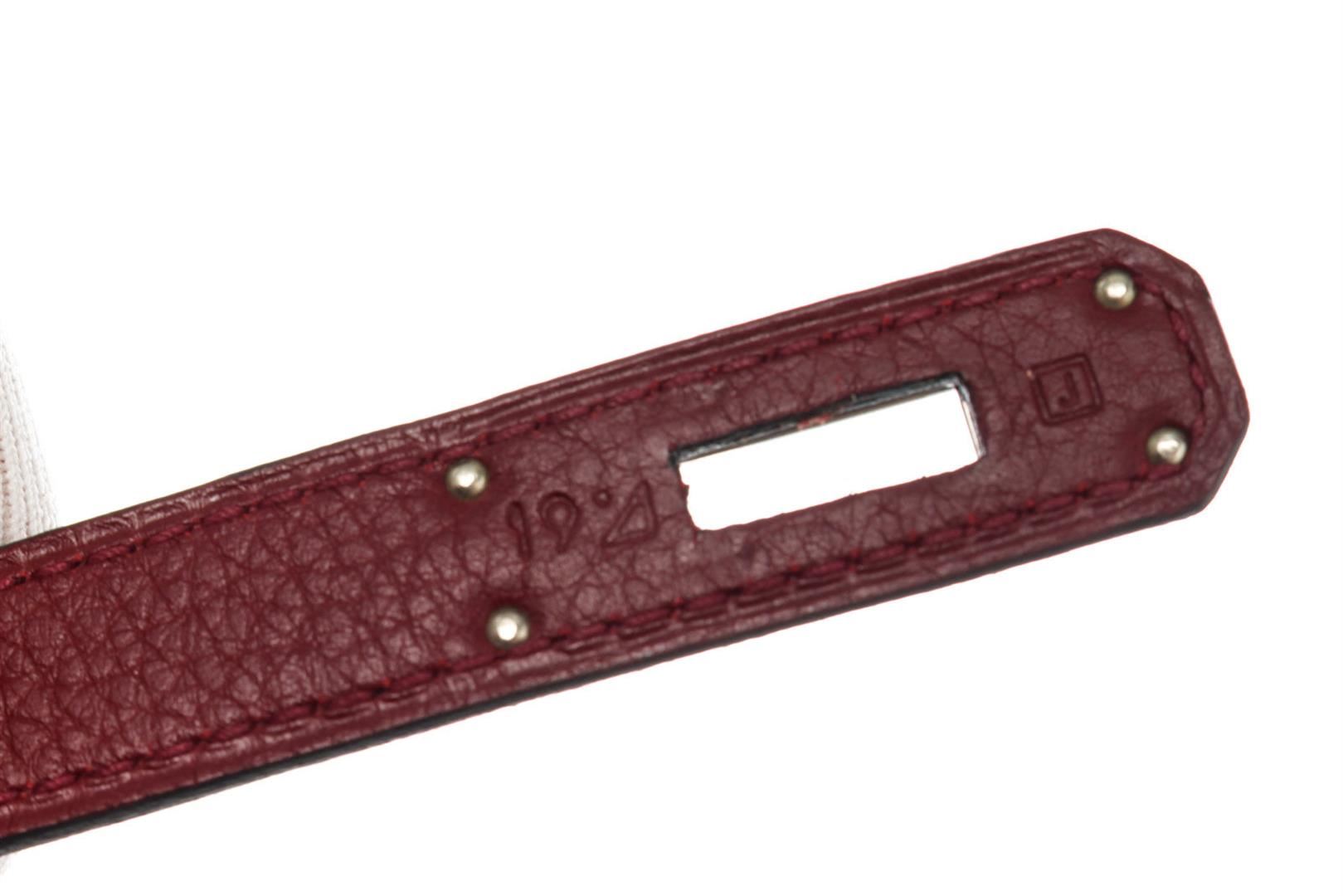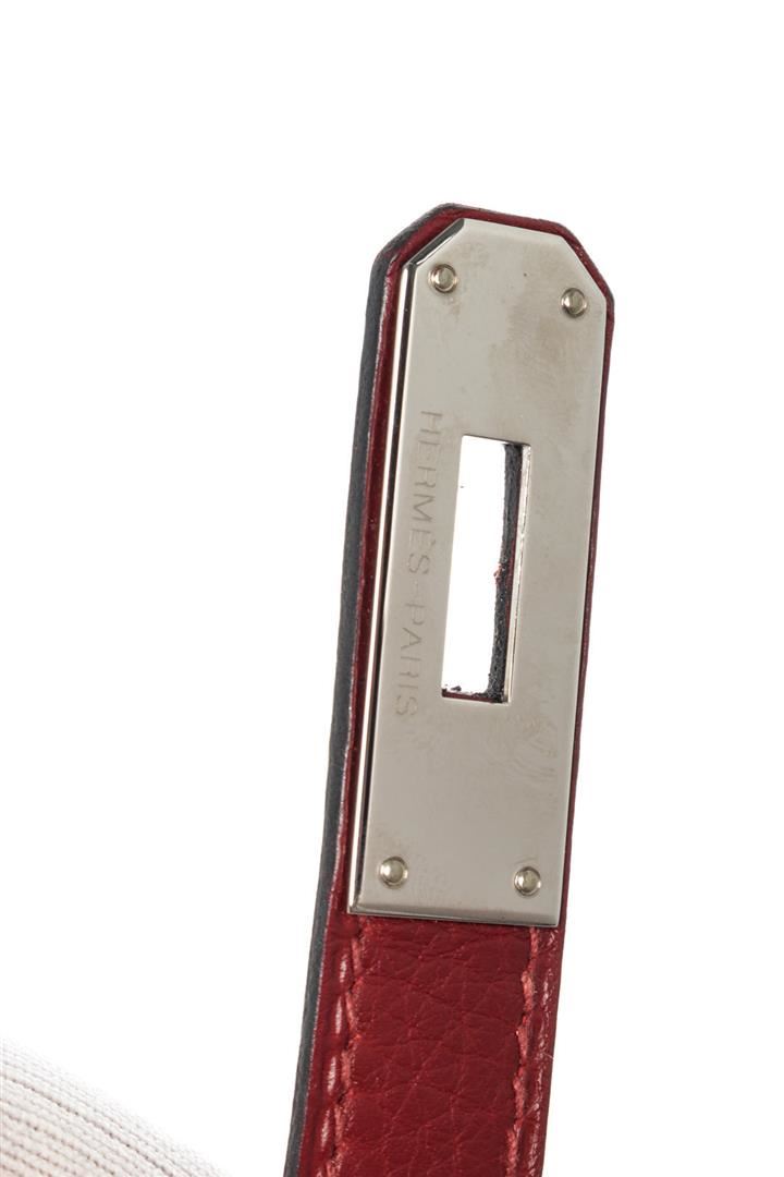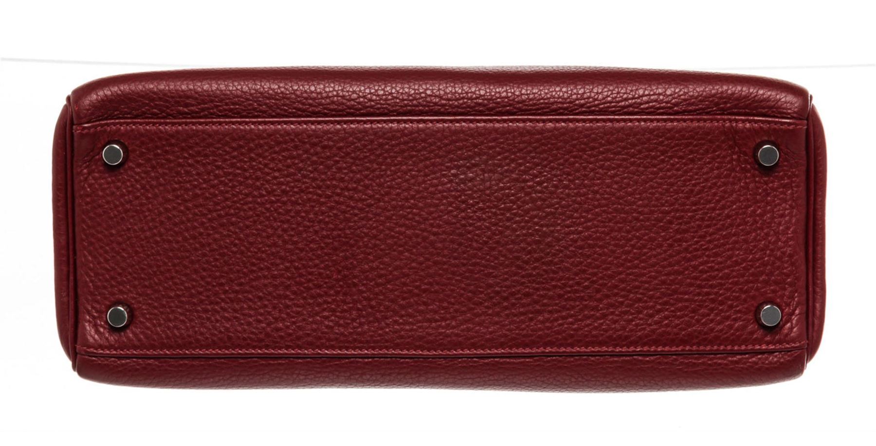 Hermes Red Leather Kelly 32cm Handbag with leather, gold-tone hardware, trim leather, interior zip pocket, lining leather, top handle, and turn lock closure.