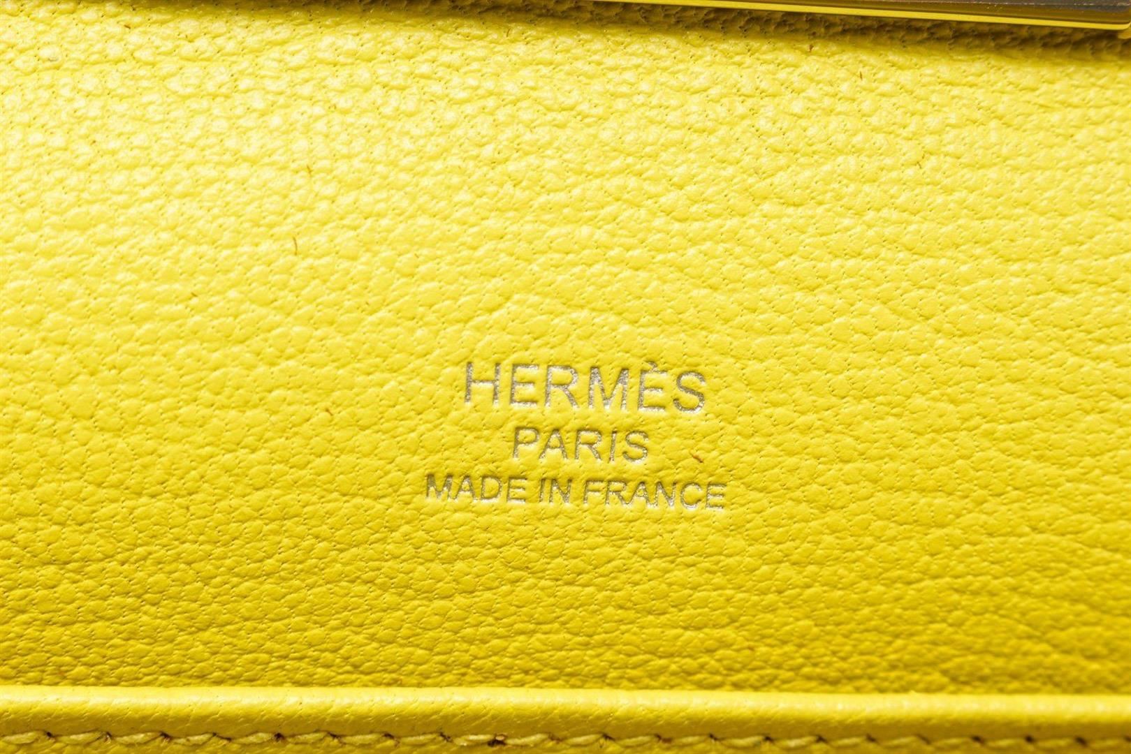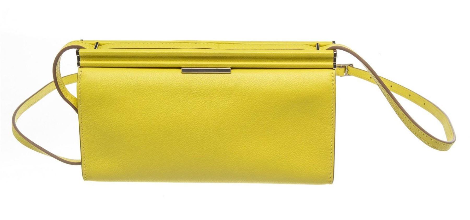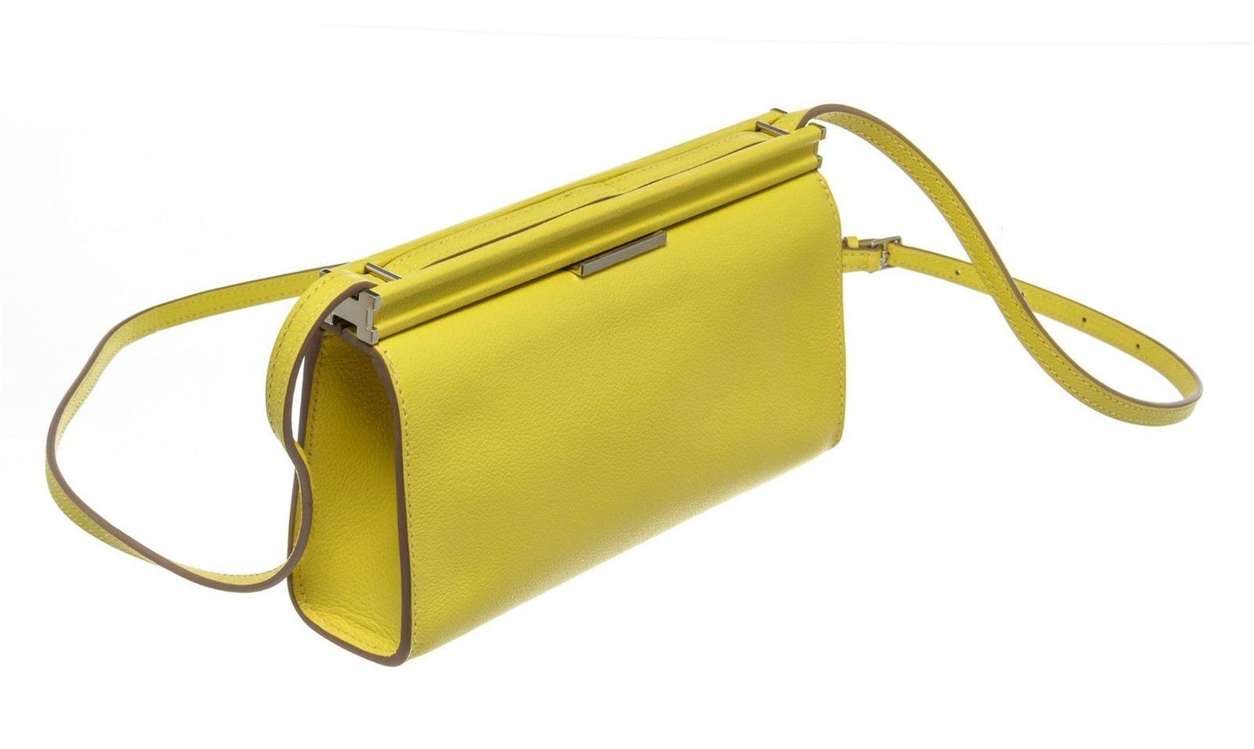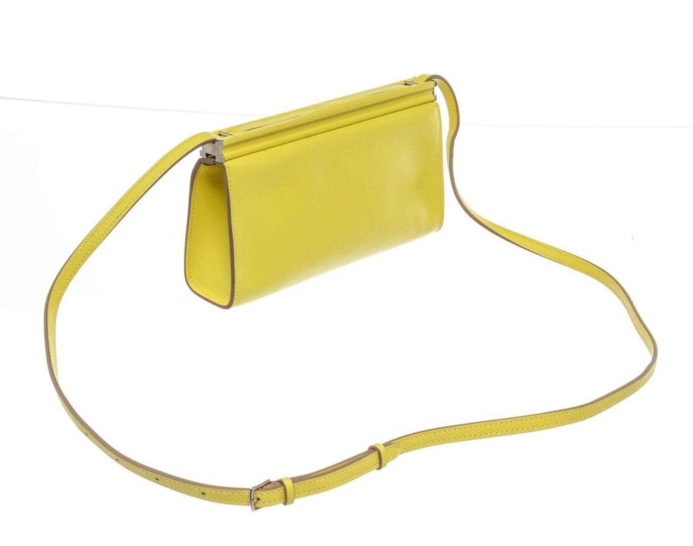 Hermes Yellow Leather Evercolor Clic-H 21 Wallet with leather, gold-tone hardware, interior slip pocket, shoulder strap and flap closure. Measurements: 8.25 in / 21 cm 2 in / 5 cm 4.25 in / 11 cm Condition: Pre-Owned Good