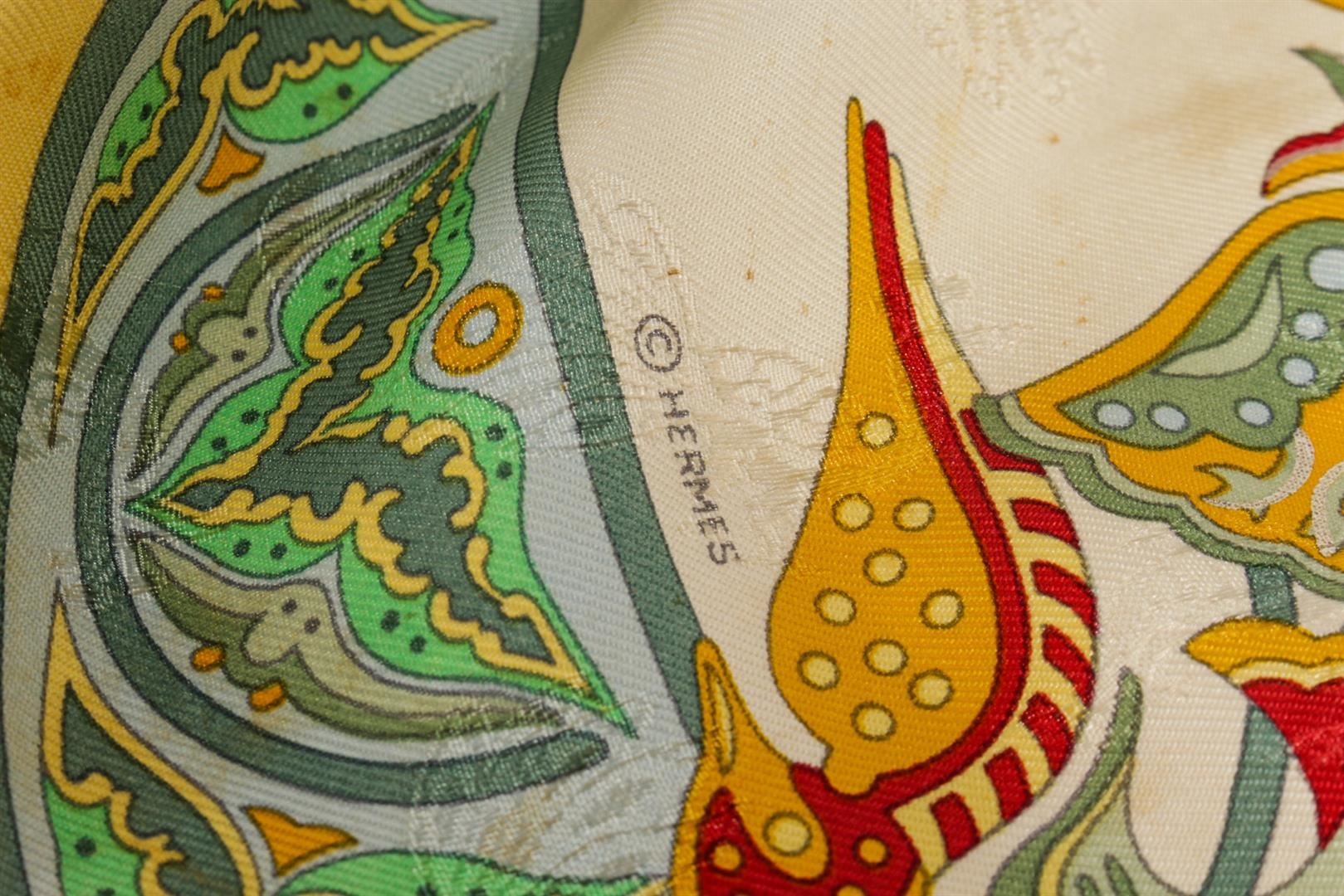 This Hermes scarf is made from 100% silk. It features a printed multicolor Ciels Byzantins pattern in off yellow cream blue and green. 35"x35"