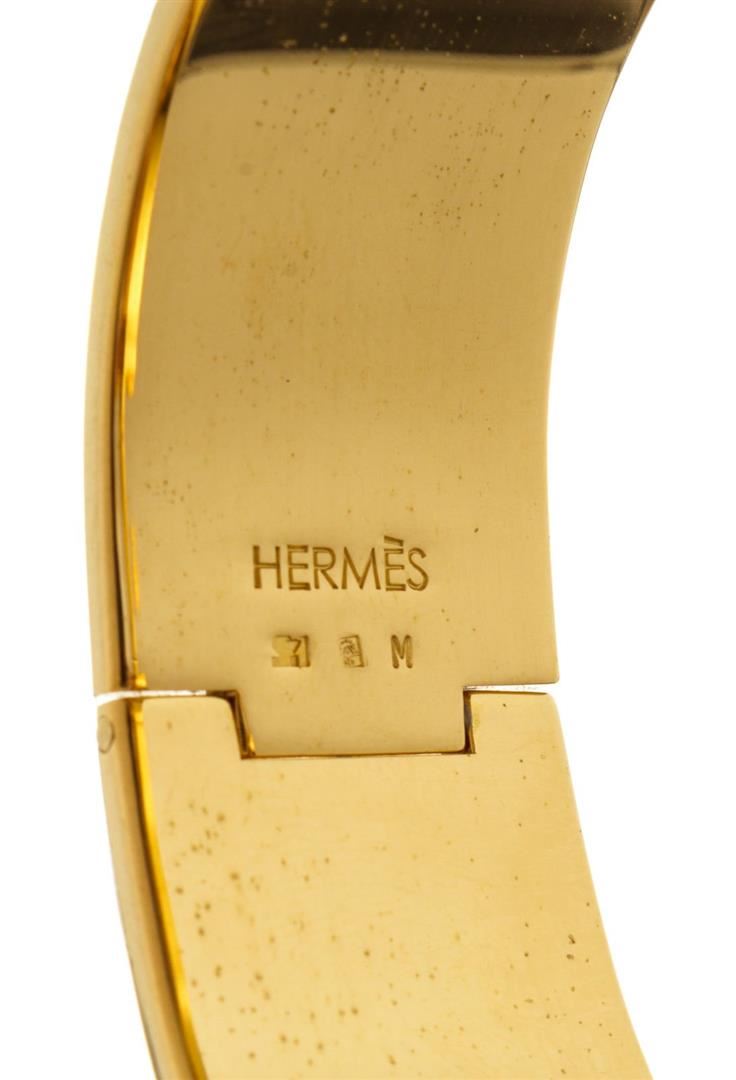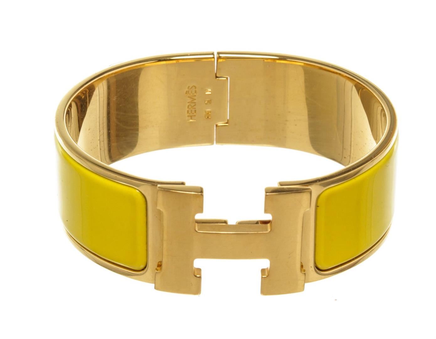 Hermes Yellow Wide Clic Clac Bracelet with gold-tone hardware and CC turn-lock closure.