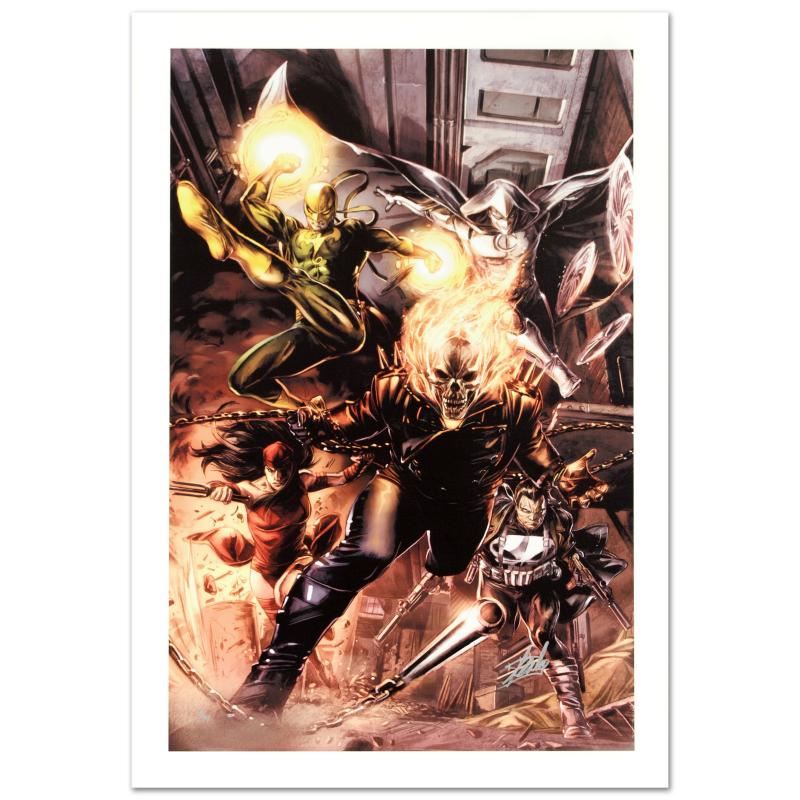 A piece of comic book history, this limited edition, from original art by Doug Braithwaite, depicts a mighty Ghost Rider. Doug Braithwaite started out working on British comics, like 2000 AD and A1, but is best known for his Marvel Comics work on the Earth X sequels, Universe X and Paradise X, as well as The Punisher Kills, the Marvel Universe, and Punisher: MAX. "Heroes For Hire #1" is a limited edition giclee on canvas by Doug Braithwaite presented by Marvel Comics, numbered and hand signed by the great Stan Lee! Includes Certificate of Authenticity! Measures approx. 18" x 27" (image).