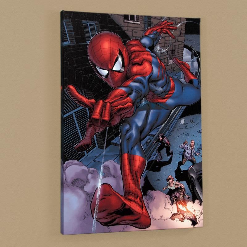 A piece of comic book history, this limited edition, from original art by Brad Walker, depicts your friendly neighborhood Spider-Man. Brad Walker is best known for his recent work on Heroes For Hire and Marvel's cosmic titles The Thanos Imperitive and Guardians of the Galaxy. His other art credits include: Actions Comics, Age of Heroes, The Avengers, Batman: War Drums, Batman: Legends of the Dark Night, and many others. "Heroes For Hire #6" is a limited edition giclee on canvas by Brad Walker, presented by Marvel Comics. This piece comes gallery wrapped and ready to hang. Includes Certificate of Authenticity! Measures approx. 18" x 27" (image); 1.5" (depth).