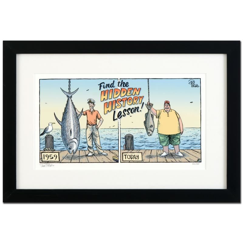 Enter a surreal and satirical world of twisted imagination and award winning creativity. "Hidden History" is a limited edition giclee on paper by Dan Piraro, creator of the critically acclaimed and award winning comic strip, Bizarro! This piece is framed, numbered and hand signed by the artist! Includes Certificate of Authenticity! Measures approx. 22" x 15" (with frame), 15" x 8" (image).