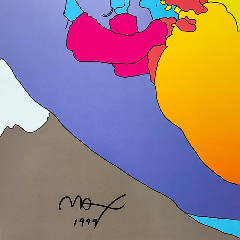 "Highest Mountain" is an offset lithograph on paper by Peter Max, hand signed by the artist. This piece comes custom framed. Includes Letter of Authenticity. Measures approx. 26" x 32.5" (frame), 22" x 28.5" (image).