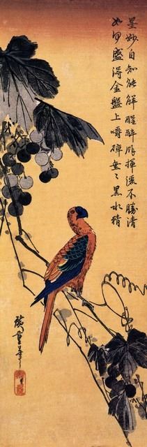 Artist: Utagawa Hiroshige - Title : Ara on a Vine - Medium: Fine Art Giclee on Canvas - Image Size: Approximately 20 inches x 6.5 inches - Unframed on Unstretched Canvas - Biography: (1797 - 12 October 1858)Hiroshige 's print s convey the beauty of Japan and provide insight into the everyday life of its citizens during the Edo period. The appeal of his tender, lyrical landscapes was not restricted to the Japanese audience.Hiroshige 's work had a profound influence on the Impressionists and Post-Impressionists of Europe: Toulouse-Lautrec was fascinated withHiroshige 's daring diagonal compositions and inventive use of perspective, while Van Gogh literally copied two ofHiroshig's prints from the famous series, 100 Famous Views of Edo in oil paint. - The borders may not be even inHiroshig's images. Please refer to the image.