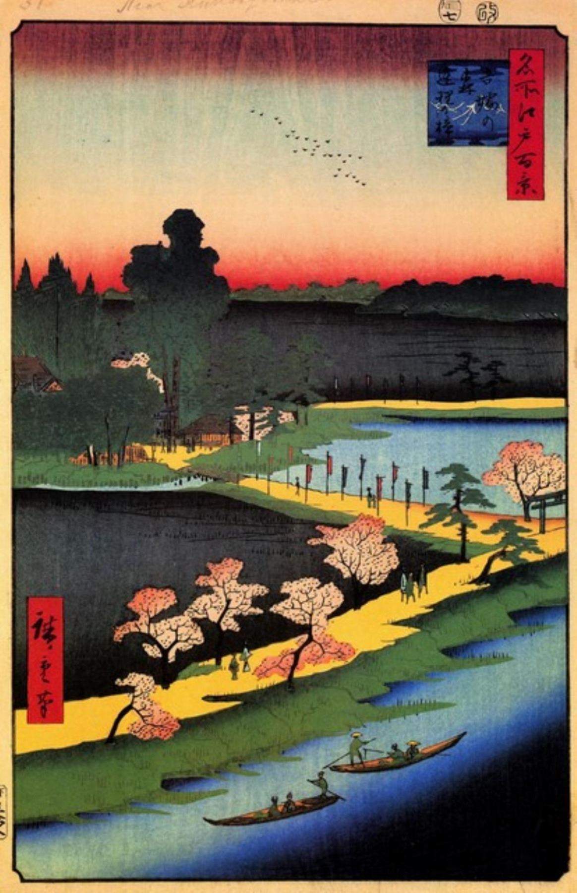 Artist: Utagawa Hiroshige - Title: Azuma Shrine and the Entwined Camphor - Medium: Fine Art Giclee on Canvas - Image Size: Approximately 32 inches x 20.5 inches - Unframed on Unstretched Canvas - Biography: (1797 - 12 October 1858) Hiroshige 's prints convey the beauty of Japan and provide insight into the everyday life of its citizens during the Edo period. The appeal of his tender, lyrical landscapes was not restricted to the Japanese audience.Hiroshige 's work had a profound influence on the Impressionists and Post-Impressionists of Europe: Toulouse-Lautrec was fascinated withHiroshige 's daring diagonal compositions and inventive use of perspective, while Van Gogh literally copied two ofHiroshig's prints from the famous series, 100 Famous Views of Edo in oil paint. - The borders may not be even inHiroshig's images. Please refer to the image.