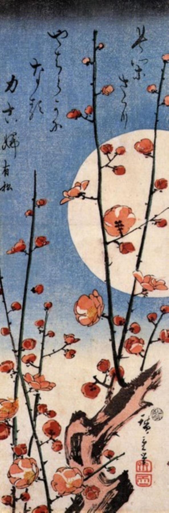 Artist: Utagawa Hiroshige - Title: Blooming Plum Tree with Full Moon - Medium: Fine Art Giclee on Canvas - Image Size: Approximately 32 inches x 10.5 inches - Unframed on Unstretched Canvas - Biography: (1797 - 12 October 1858) Hiroshige 's print s convey the beauty of Japan and provide insight into the everyday life of its citizens during the Edo period. The appeal of his tender, lyrical landscapes was not restricted to the Japanese audience.Hiroshige 's work had a profound influence on the Impressionists and Post-Impressionists of Europe: Toulouse-Lautrec was fascinated withHiroshige 's daring diagonal compositions and inventive use of perspective, while Van Gogh literally copied two ofHiroshig's prints from the famous series, 100 Famous Views of Edo in oil paint. - The borders may not be even inHiroshig's images. Please refer to the image.