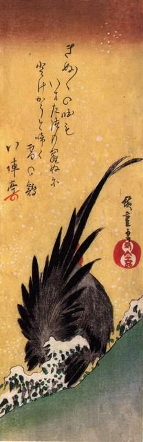 Artist: Utagawa Hiroshige - Title: Cock in Snow - Medium: Fine Art Giclee on Canvas - Image Size: Approximately 20 inches x 6.5 inches - Unframed on Unstretched Canvas - Biography: (1797 - 12 October 1858) Hiroshige 's print s convey the beauty of Japan and provide insight into the everyday life of its citizens during the Edo period. The appeal of his tender, lyrical landscapes was not restricted to the Japanese audience.Hiroshige 's work had a profound influence on the Impressionists and Post-Impressionists of Europe: Toulouse-Lautrec was fascinated withHiroshige 's daring diagonal compositions and inventive use of perspective, while Van Gogh literally copied two ofHiroshig's prints from the famous series, 100 Famous Views of Edo in oil paint. - The borders may not be even inHiroshig's images. Please refer to the image.