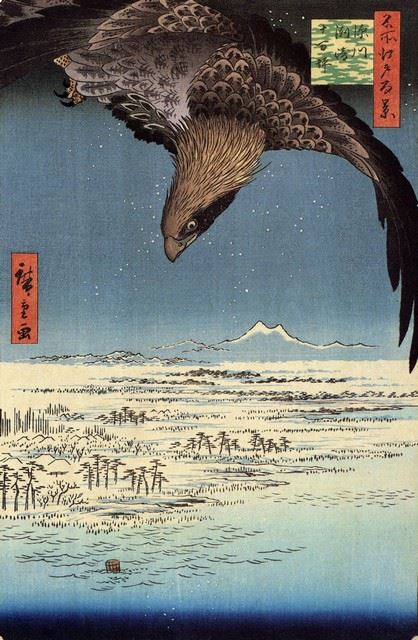 Artist: Utagawa Hiroshige - Title: Eagle over the Lowlands Near Susaki - Medium: Fine Art Giclee on Canvas - Image Size: Approximately 20inches x 13 inches - Unframed on Unstretched Canvas - Biography: (1797 - 12 October 1858)