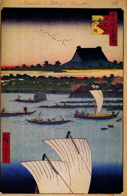 Artist: Utagawa Hiroshige - Title: Honganji Temple - Medium: Fine Art Giclee on Canvas - Image Size: Approximately 32 inches x 20.5 inches - Unframed on Unstretched Canvas - Biography: (1797 - 12 October 1858) Hiroshige 's prints convey the beauty of Japan and provide insight into the everyday life of its citizens during the Edo period. The appeal of his tender, lyrical landscapes was not restricted to the Japanese audience.Hiroshige 's work had a profound influence on the Impressionists and Post-Impressionists of Europe: Toulouse-Lautrec was fascinated withHiroshige 's daring diagonal compositions and inventive use of perspective, while Van Gogh literally copied two ofHiroshig's prints from the famous series, 100 Famous Views of Edo in oil paint. - The borders may not be even inHiroshig's images. Please refer to the image.