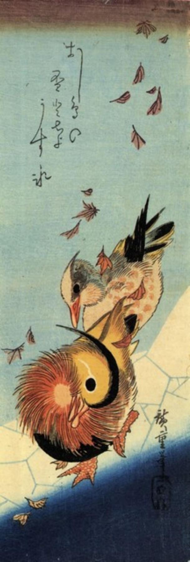 Artist: Utagawa Hiroshige - Title: Mandarin Duck on a Frozen Pond - Medium: Fine Art Giclee on Canvas - Image Size: Approximately 20 inches x 6.75 inches - Unframed on Unstretched Canvas - Biography: (1797 - 12 October 1858) Hiroshige 's print s convey the beauty of Japan and provide insight into the everyday life of its citizens during the Edo period. The appeal of his tender, lyrical landscapes was not restricted to the Japanese audience.Hiroshige 's work had a profound influence on the Impressionists and Post-Impressionists of Europe: Toulouse-Lautrec was fascinated withHiroshige 's daring diagonal compositions and inventive use of perspective, while Van Gogh literally copied two ofHiroshig's prints from the famous series, 100 Famous Views of Edo in oil paint. - The borders may not be even inHiroshig's images. Please refer to the image.