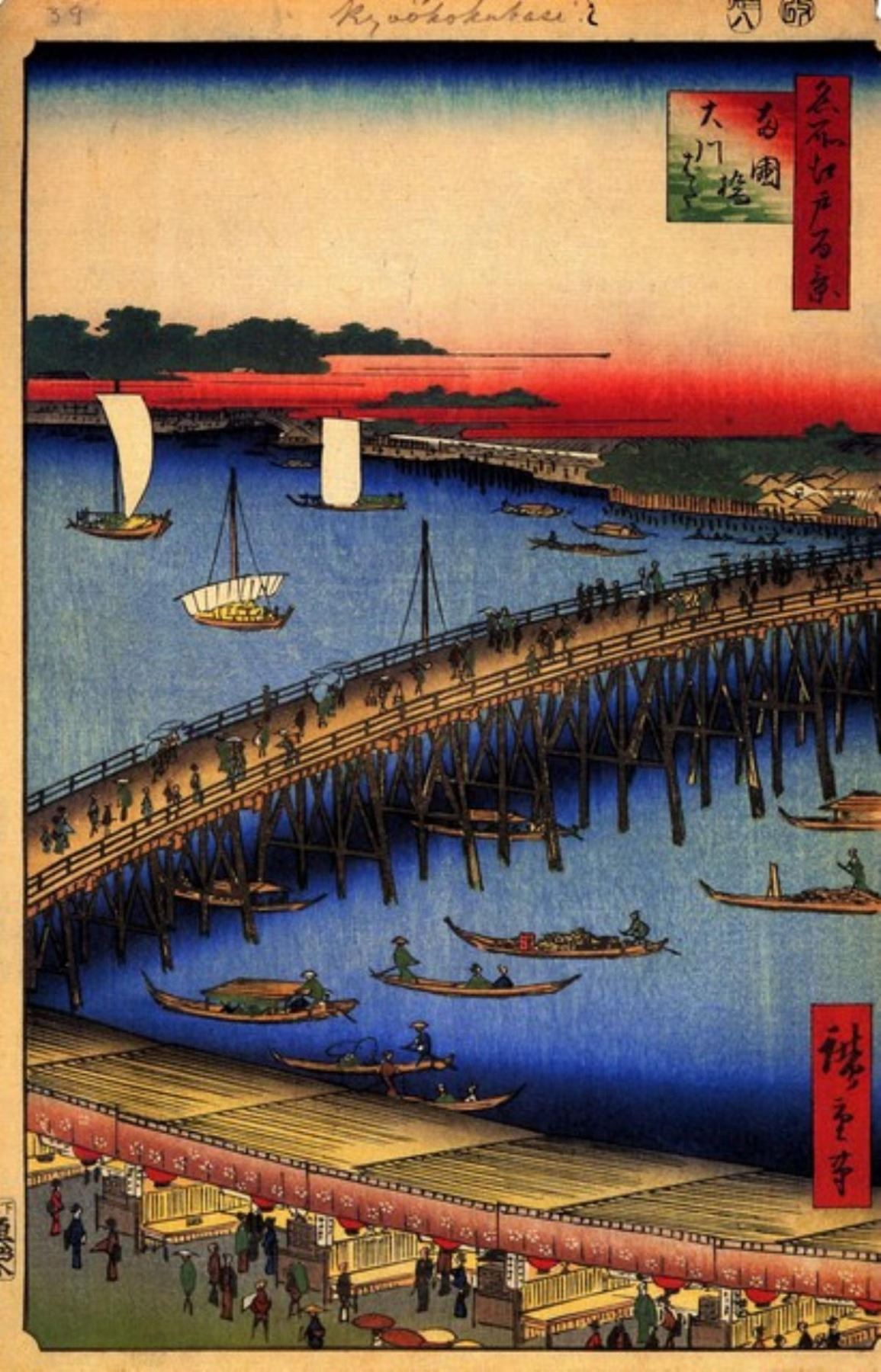 Artist: Utagawa Hiroshige - Title: Ryogoku Bridge and the Great Riverbank - Medium: Fine Art Giclee on Canvas - Image Size: Approximately 32 inches x 20.5 inches - Unframed on Unstretched Canvas - Biography: (1797 - 12 October 1858) Hiroshige 's prints convey the beauty of Japan and provide insight into the everyday life of its citizens during the Edo period. The appeal of his tender, lyrical landscapes was not restricted to the Japanese audience.Hiroshige 's work had a profound influence on the Impressionists and Post-Impressionists of Europe: Toulouse-Lautrec was fascinated withHiroshige 's daring diagonal compositions and inventive use of perspective, while Van Gogh literally copied two ofHiroshig's prints from the famous series, 100 Famous Views of Edo in oil paint. - The borders may not be even inHiroshig's images. Please refer to the image.