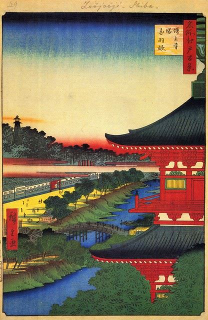 Artist: Utagawa Hiroshige - Title: Zojoji Pagoda - Medium: Fine Art Giclee on Canvas - Image Size: Approximately 20 inches x 13 inches - Unframed on Unstretched Canvas - Biography: (1797 - 12 October 1858) Hiroshige 's prints convey the beauty of Japan and provide insight into the everyday life of its citizens during the Edo period. The appeal of his tender, lyrical landscapes was not restricted to the Japanese audience.Hiroshige 's work had a profound influence on the Impressionists and Post-Impressionists of Europe: Toulouse-Lautrec was fascinated withHiroshige 's daring diagonal compositions and inventive use of perspective, while Van Gogh literally copied two ofHiroshig's prints from the famous series, 100 Famous Views of Edo in oil paint. - The borders may not be even inHiroshig's images. Please refer to the image.