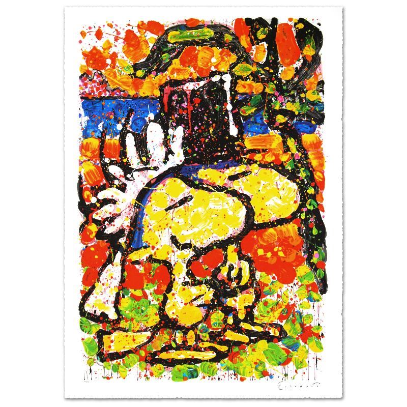 Master Artist Tom Everhart is the protege of famed "Peanuts" creator, Charles M. Schulz (1922â€"2000). As the only artist in the world granted the rights to draw the "Peanuts" characters in his own work, Everhart creates vibrant, extremely collectible rainbow masterpieces featuring Snoopy, Woodstock and the gang. "Hitched" is a limited edition hand pulled original lithograph on museum quality deckle-edge paper, numbered and hand signed by Everhart! Includes Certificate of Authenticity! Measures approx. 31" x 44" (with border), 26" x 39" (image). This artwork was created on one of two rare antique Marinoni Voirin lithograph presses that date back to the 1800's, and are reputed to come from the Paris print shop used by Henri Toulouse-Lautrec. There are only 7 of these magnificent beasts left in the world: the smaller one (with a print bed size of 25" x 35"), weighs 9 tons, and the larger one weighs in at 11 tons (print bed size 31" x 47"). The significance of this is that the lithographs produced by this method are of the finest quality, using techniques that are so labor and time intensive that very few master printers know how to operate and care for these presses today. Each lithograph is created with hand-mixed colors applied one at a time - a highly trained and synchronized team must hand feed each museum-quality sheet of paper through the press numerous times in order to set the colors and impressions, while the Chromist - a trained color specialist - adjusts each color by look and feel to match the original artwork, as if mixing a potion. The result is an image with maximum pigment saturation, formed through rich layers of color that imbue the artwork with a permanency of brilliance - proven over centuries to last. In contrast, today's printers use a method more akin to a dot matrix style application, with the colors all premixed and sprayed onto a sheet in a uniform layer, resulting in a much less saturated image that is susceptible to fading and imperfect color reproduction. This is one of the final Tom Everhart editions to be printed using this very special technique.