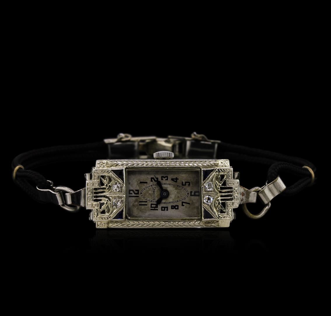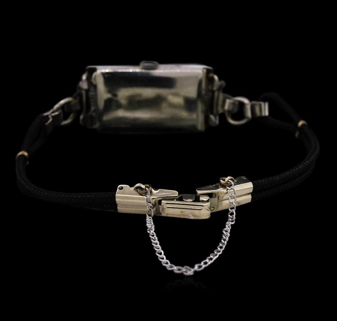4 single cut diamonds; black rope bracelet; 6-6.5" long; Clasp is stamped: USA 1/40-10k RGP; Inside case stamped: Hoffrer's 14k; Case Measurements: 14 mm x 34 mm; Watch is in working condition!
