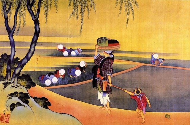 Artist: Katsushika Hokusai - Title: Rice Fields - Medium: Fine Art Giclee on Canvas - Image Size: Approximately 21 inches x 32 inches - Unframed on Unstretched Canvas - Biography: ( c. 31 October 1760 - 10 May 1849), known simply as Hokusai, was a Japanese artist, ukiyo-e painter and printmaker of the Edo period. Born in Edo (now Tokyo), Hokusai is best known as author of the woodblock printseries Thirty-six Views of Mount Fuji which includes the internationally iconic print, The Great Wave off Kanagawa.