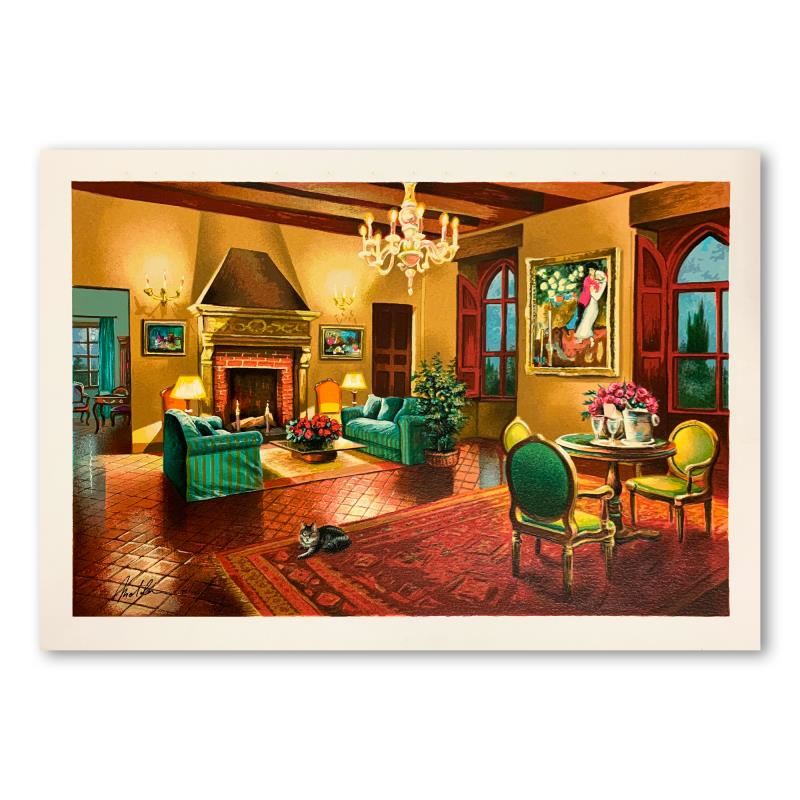 "Homage to Chagall" is a limited edition serigraph on paper by Anatoly Metlan. It is numbered and hand signed and includes a letter of authenticity. Measures approximately 14" x 22" (image).