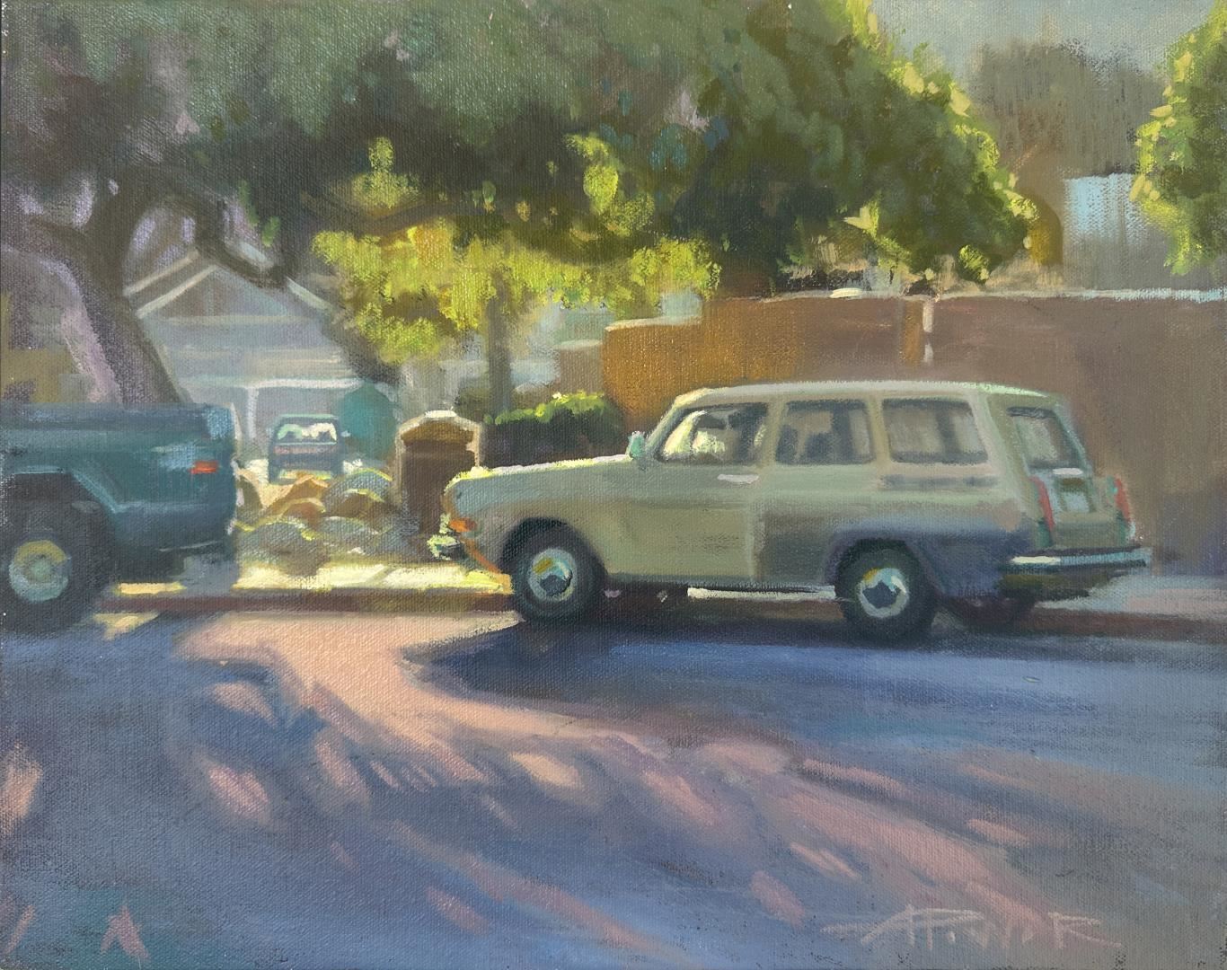 Anette Power has captured the glow of the setting sun in a local neighborhood in this 11x14 oil on canvas panel, with artist's COA