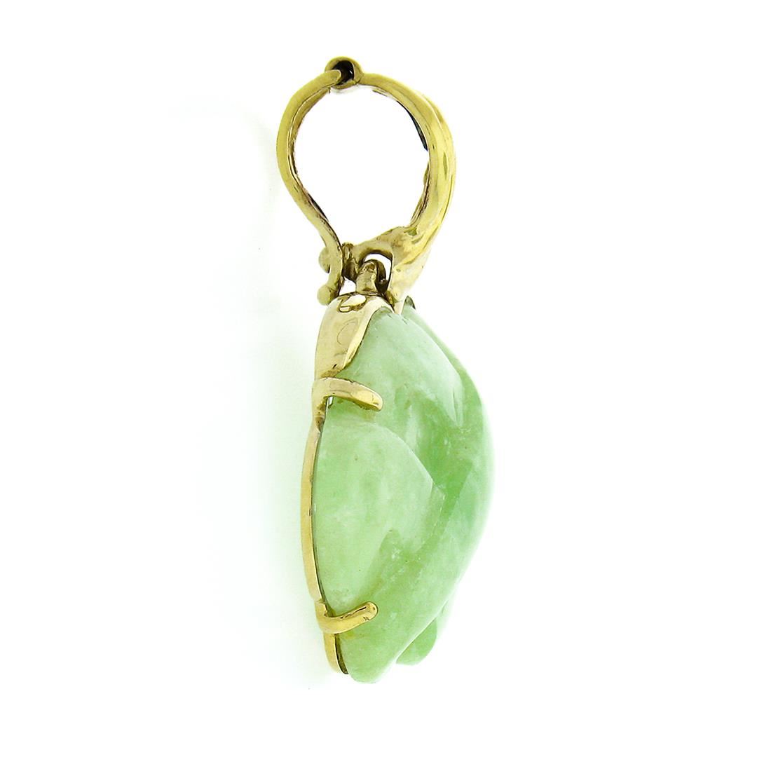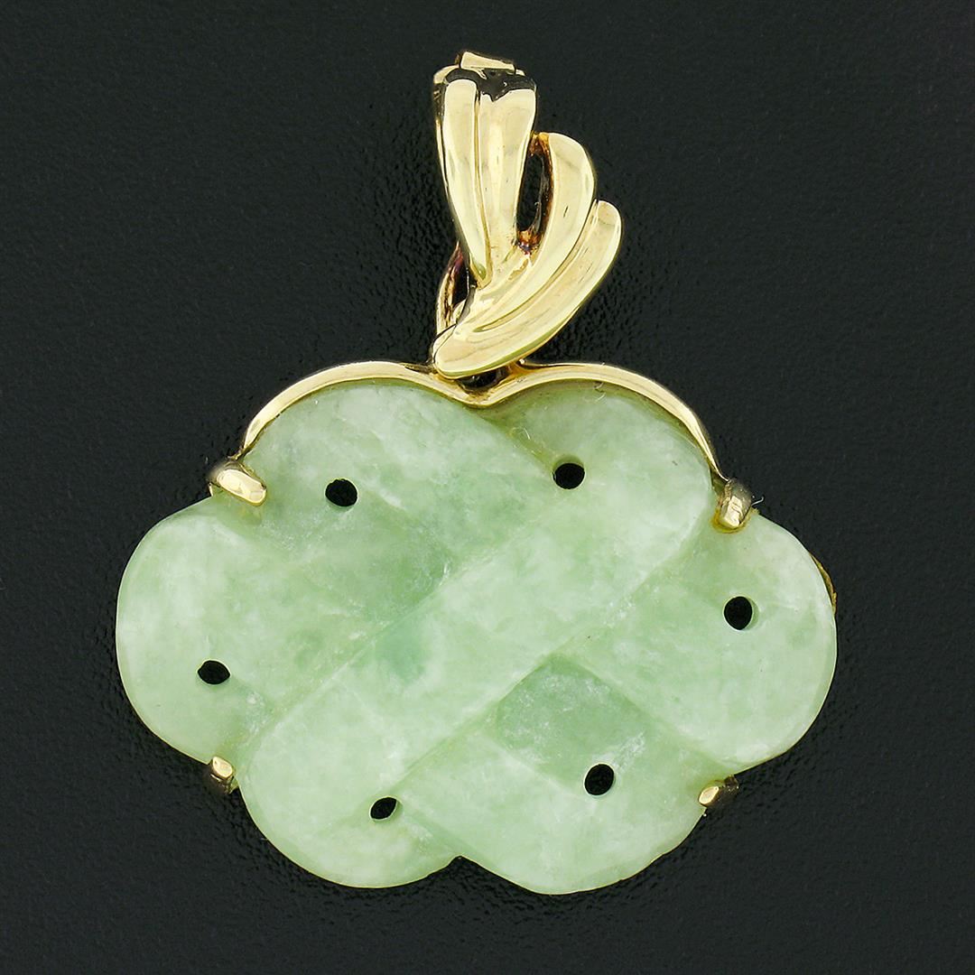A solid 14k yellow gold hon Kong overlap pendant, with carved jade ( 25.25x18.0mm). The pendant weighs a total of 5.44 grams, measures 29.50x25.25mm including the bail, and the inside of the bail measures 7.0x6.7mm.