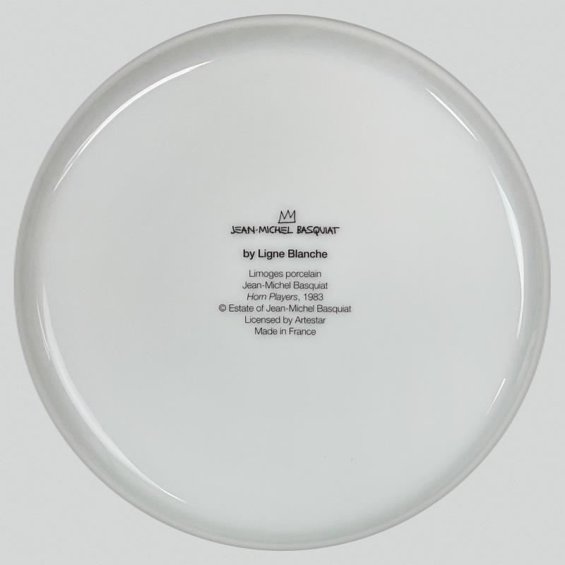 "Horn Players 1983" is a Limoges porcelain plate bearing the plate signature inverso of Jean-Michel Basquiat (1960-1988). This plate is custom framed and floated on linen. Measures approx. 16" x 16" (frame) 11" (plate diameter).