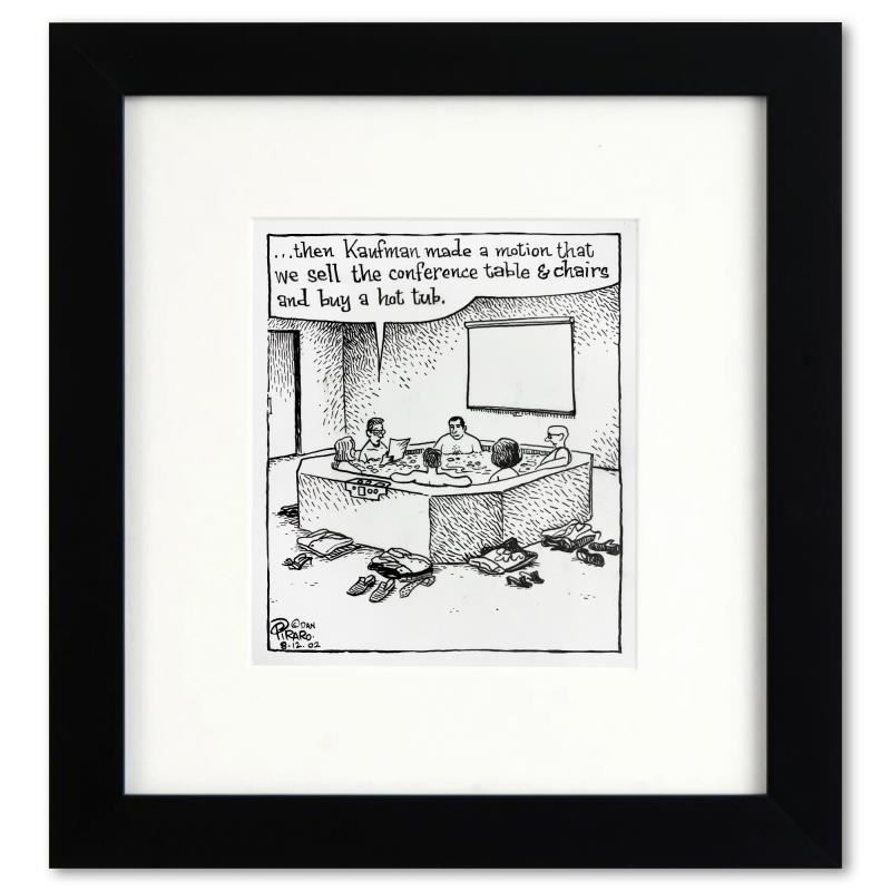 Enter a surreal and satirical world of twisted imagination and award winning creativity. "Hot Tub Board Meeting" is an original pen & ink drawing on paper by Dan Piraro, creator of the critically acclaimed and award winning comic strip, Bizarro. This piece is hand signed, comes custom framed and includes a letter of authenticity. Measures approximately 12" x 11" (frame), 7" x 6" (image).This item requires special handling and may have a longer than usual turnaround.