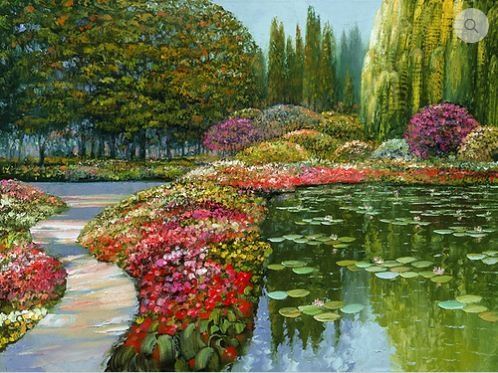 Howard Behrens COLORS OF GIVERNY, THE (from THE "TRIBUTE TO MONET" COLLECTION). This particular piece is from the 2010 "Five Carat Diamond" collection and was a special edition for an Art Connoisseur cruise. The Five Carat Diamond Collection is considered by far the top and highest value of any of the Behrens embellished Giclees. Please note that other listings with the same title may have not come from this particular and highly sought after edition. Intensely texturized/embellished, almost looks 3-D. It is almost indistinguishable from the original oil (except for the edition number) Medium: Hand Signed Limited Edition Heavily Embellished Giclee on Stretched Canvas Dimensions: 24 x 32 inches NOTE: Edition number may differ from the one pictured.