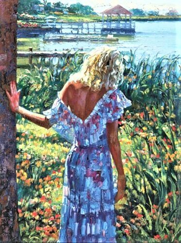Howard Behrens "MY BELOVED BY THE LAKE (from "MY BELOVED" COLLECTION)" Heavily Embellished Hand Signed and Numbered LE Stretched Canvas Giclee, Howard Behren's painted three images to honor his wife, Judy Behrens, which is know as the "My Beloved series"