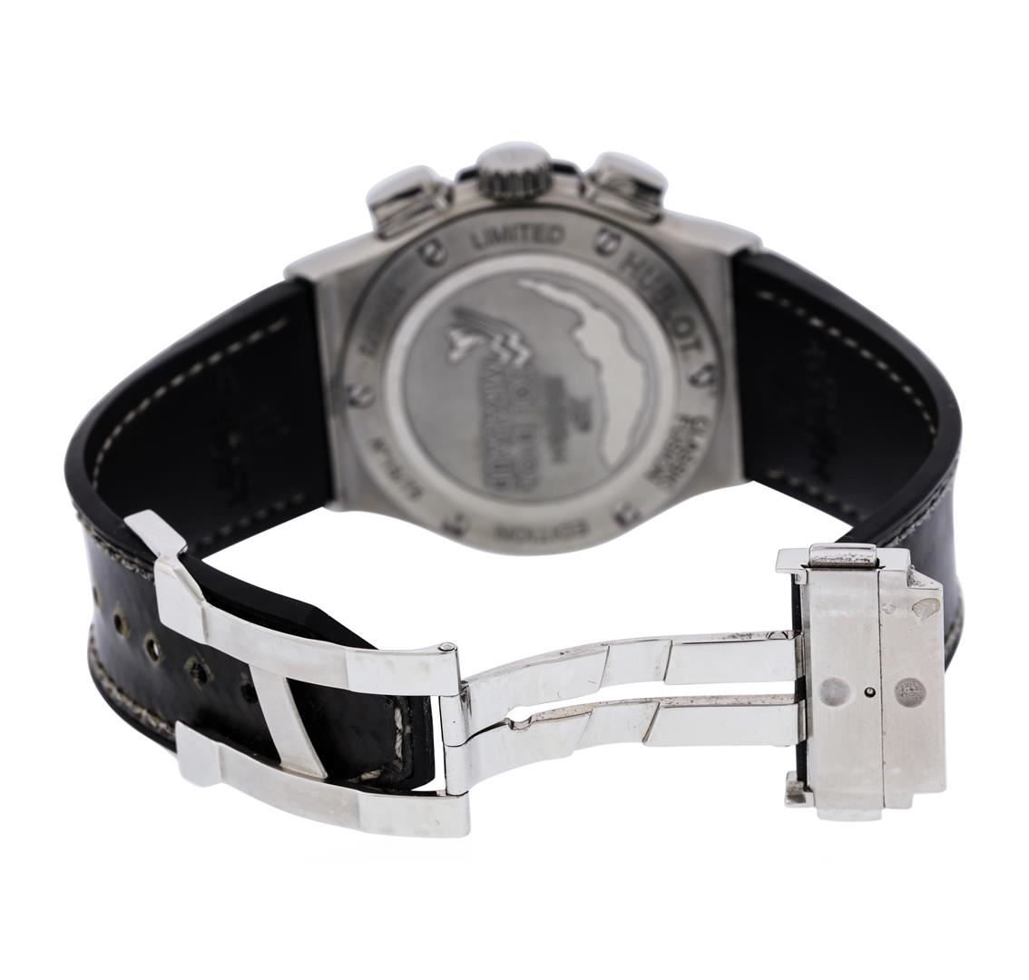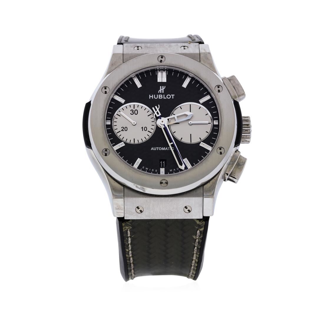 One man's, hand crafted and machine milled HUBLOT round case BOL D'OR MIRABAUD 75 Anniversary Edition wrist watch electronically tested Titanium, Crystal: Anti-Reflective Sapphire, Movement: Chronograph Automatic, Dial: Gray Carbon Fiber with baton, parallel type hands and stick marker numerals, Calendar: At 6 O'clock, Bracelet: leather, Condition: G-4 average.. Total Weight of Watch 118.10gm. GAS Appraised at $6,600.00.