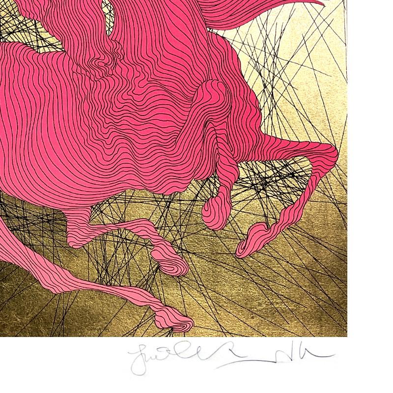 Huit Chevaux by Azoulay, Guillaume. "Huit Chevaux" is a limited edition serigraph on paper with hand laid gold leaf by Guillaume Azoulay, numbered and hand signed by the artist. Includes Letter of Authenticity. Measures approx. 48" x 39" (border), 42" x 32" (image). There may be minor imperfections in the white border area but the piece is in overall good condition.