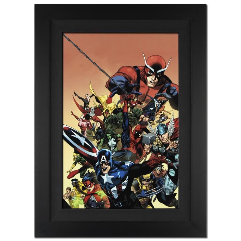 A piece of comic book history, this limited edition, from original art by Leinil Francis Yu, depicts Captain America, Spider-Man, Thor, Wolverine, Hulk, Ant-Man, She Hulk, Vision and Iron-Man, among many others. After winning the Wizard's Drawing Board Contest, Marvel Comics hired Leinil Francis Yu to work on the Wolverine series. After his run on Wolverine, he moved on to work on Marvel's core X-Men title in 2000. Yu continued to work on other Marvel titles such as Fantastic Four, Ultimate Wolverine vs. Hulk and New Avengers. "I Am An Avenger #1" is an extremely limited edition giclee on canvas by Leinil Francis Yu presented by Marvel Comics, hand signed by the great Stan Lee and numbered out of only 10! This piece comes custom framed and ready to hang. Includes Certificate of Authenticity! Measures approx. 25" x 34" (with frame); 18" x 27" (image).