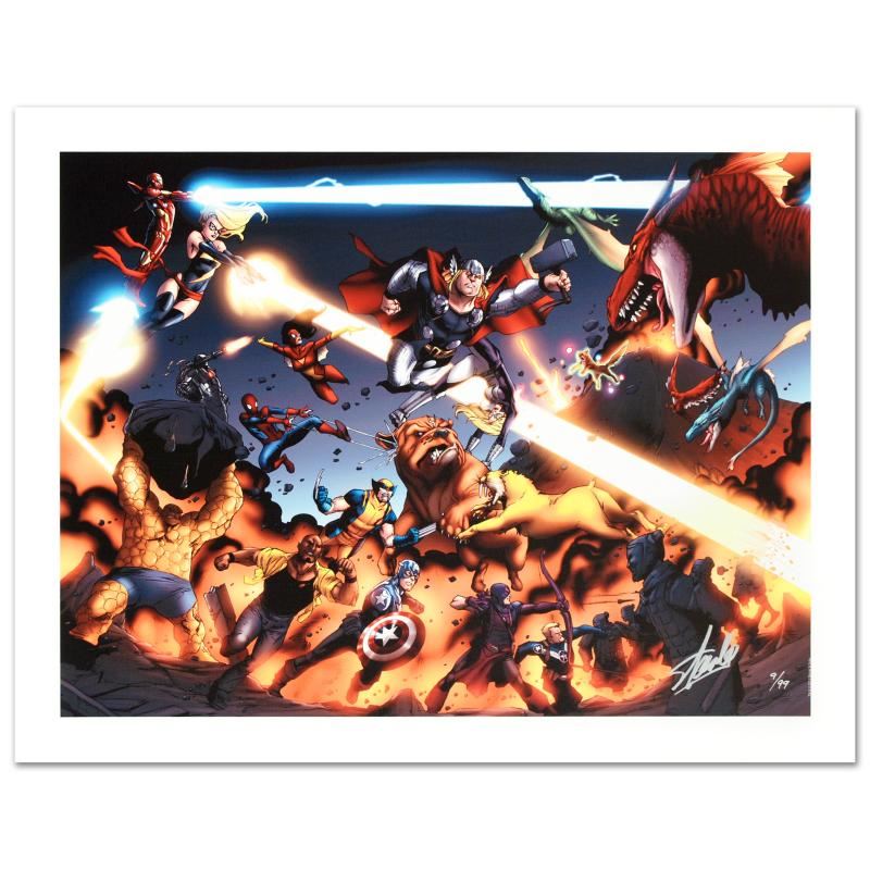 A piece of comic book history, this limited edition, from original art by Daniel Acuna, depicts Thor and the Avengers. Spanish artist Daniel Acuna cites artists like Jack Kirby and Simon Bisley as his early artist influences. After doing some occasional cover art for Marvel, Acuna signed an exclusive contract with Marvel in 2007. "I Am An Avenger #4" is a limited edition giclee on canvas by Daniel Acuna presented by Marvel Comics, numbered and hand signed by the great Stan Lee! Includes Certificate of Authenticity! Measures approx. 24" x 18" (image). Please allow 5 additional business for items that include canvas stretch or framing.