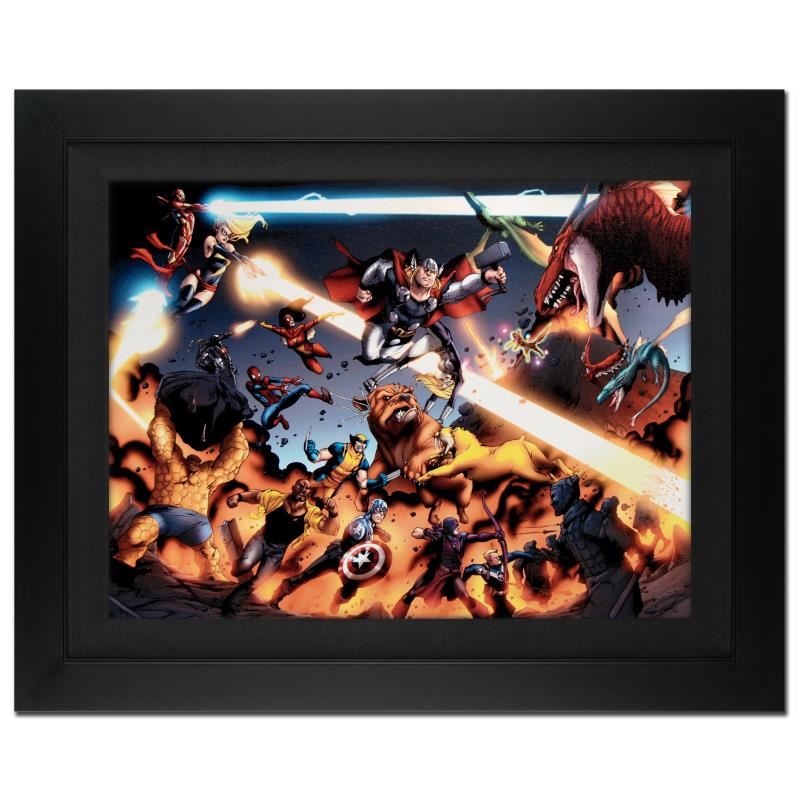 A piece of comic book history, this limited edition, from original art by Daniel Acuna, depicts Thor and the Avengers. Spanish artist Daniel Acuna cites artists like Jack Kirby and Simon Bisley as his early artist influences. After doing some occasional cover art for Marvel, Acuna signed an exclusive contract with Marvel in 2007. "I Am An Avenger #4" is an extremely limited edition giclee on canvas by Daniel Acuna presented by Marvel Comics, hand signed by the great Stan Lee and numbered out of only 10! This piece comes custom framed and ready to hang. Includes Certificate of Authenticity! Measures approx. 31" x 25" (with frame), 24" x 18" (image).
