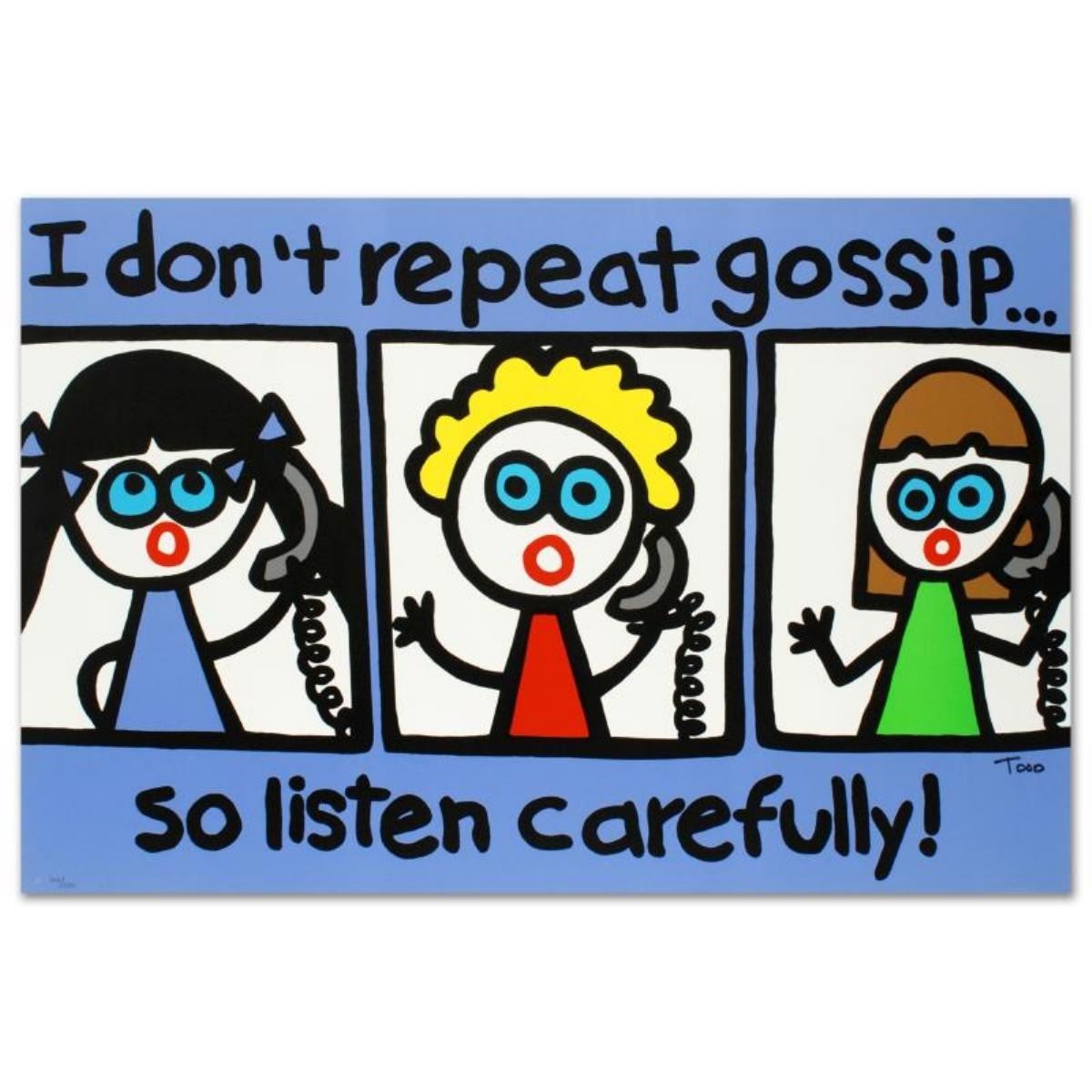 Pop artist Todd Goldman is known all across the globe for his whip-smart and wickedly funny puns and pictures! "I Don't Repeat Gossip" is a limited edition lithograph on paper, numbered and hand signed by Todd. Includes Certificate of Authenticity! Measures approx. 34.5" x 23" (no border).
